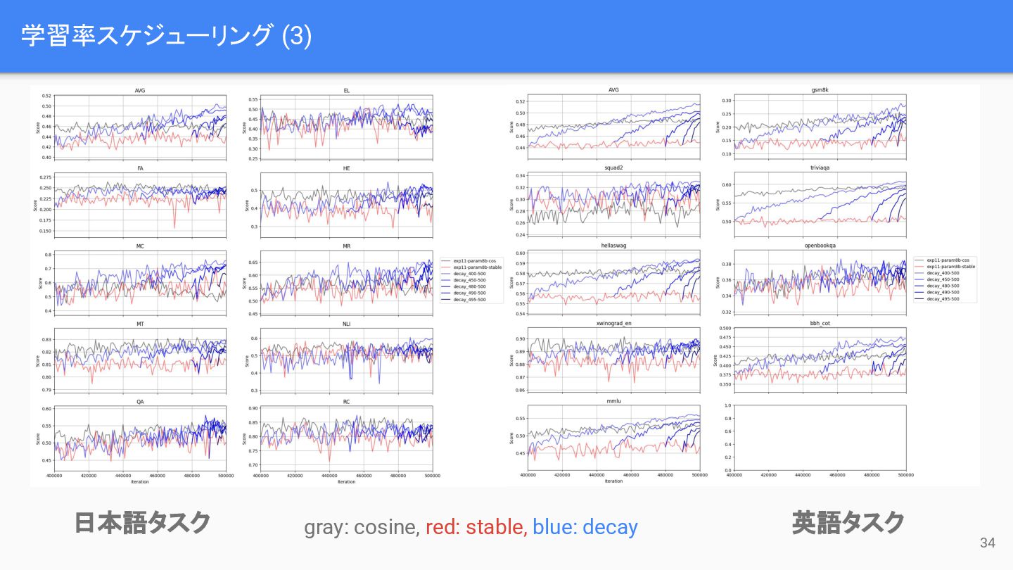 学習率スケジューリング (2) 33 • 学習率スケジューリングの決定実験 ◦ 長期間学習設定 (~500k steps) による検証