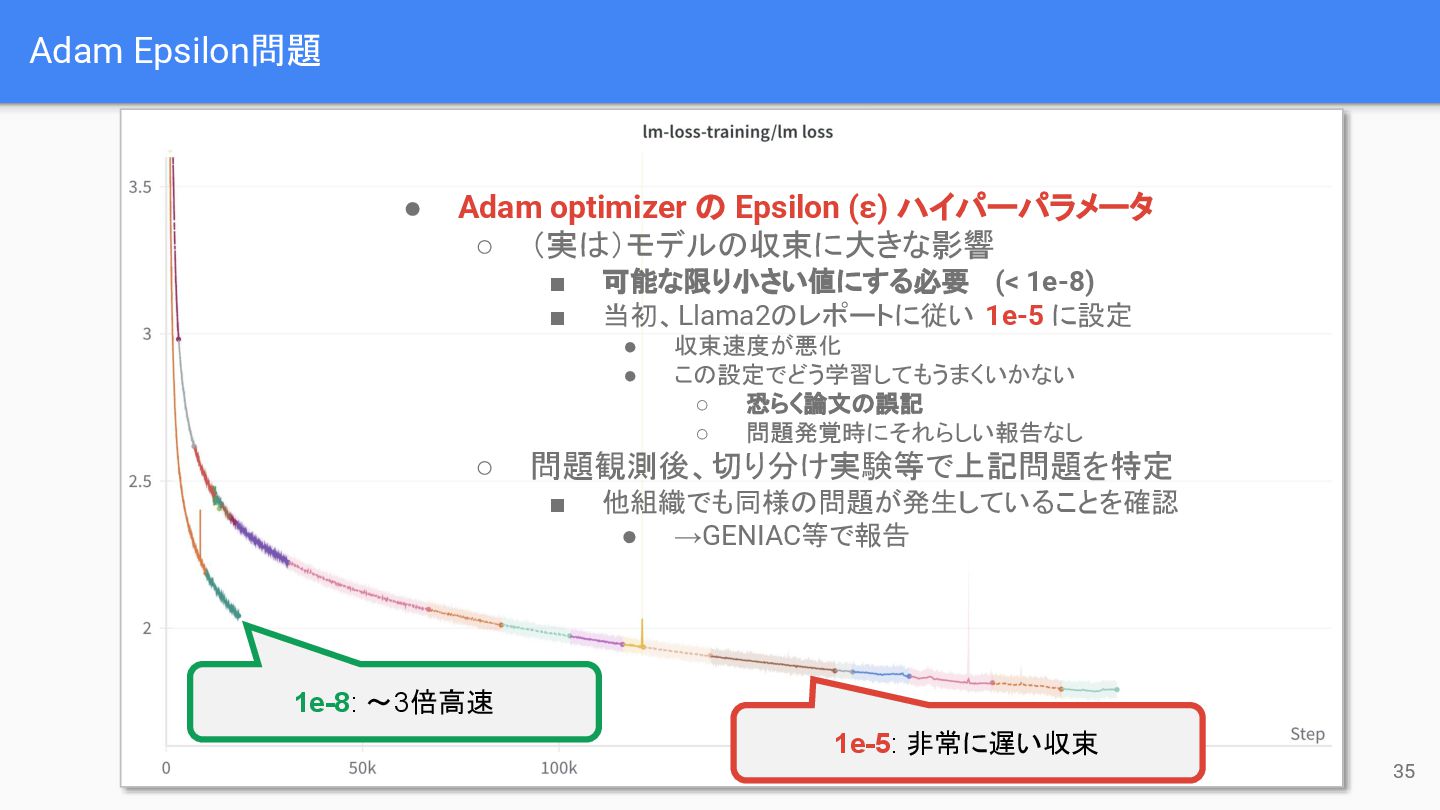 ◦ (実は)モデルの収束に大きな影響 ▪ 可能な限り小さい値にする必要 (< 1e-8) ▪ 当初、Llama2のレポートに従い 1e-5 に設定 • 収束速度が悪化 • この設定でどう学習してもうまくいかない ◦ 恐らく論文の誤記 ◦ 問題発覚時にそれらしい報告なし ◦ 問題観測後、切り分け実験等で上記問題を特定 ▪ 他組織でも同様の問題が発生していることを確認 • →GENIAC等で報告 1e-8: ~3倍高速 1e-5: 非常に遅い収束