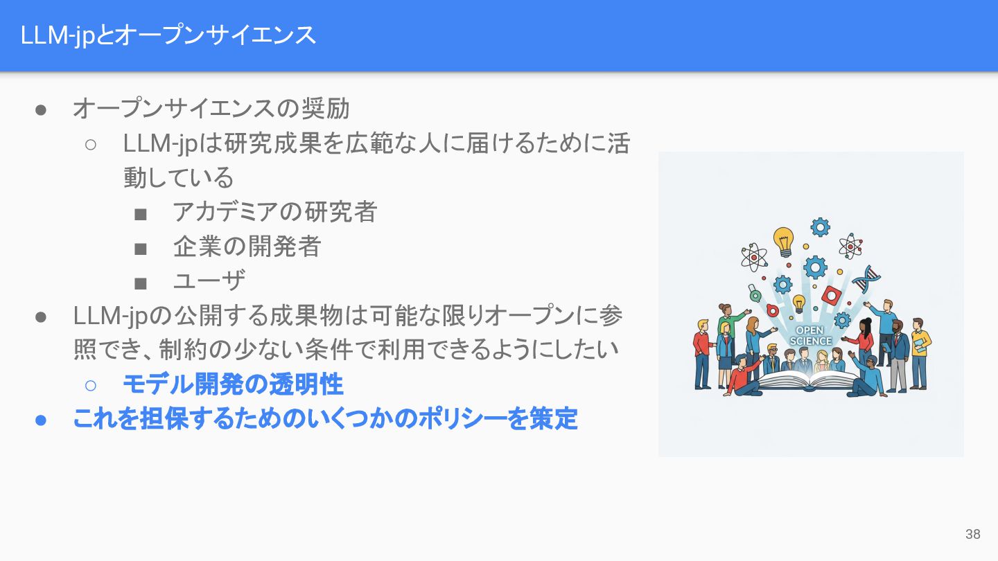 LLM-jpとオープンサイエンス 38 • オープンサイエンスの奨励 ◦ LLM-jpは研究成果を広範な人に届けるために活 動している ▪ アカデミアの研究者 ▪