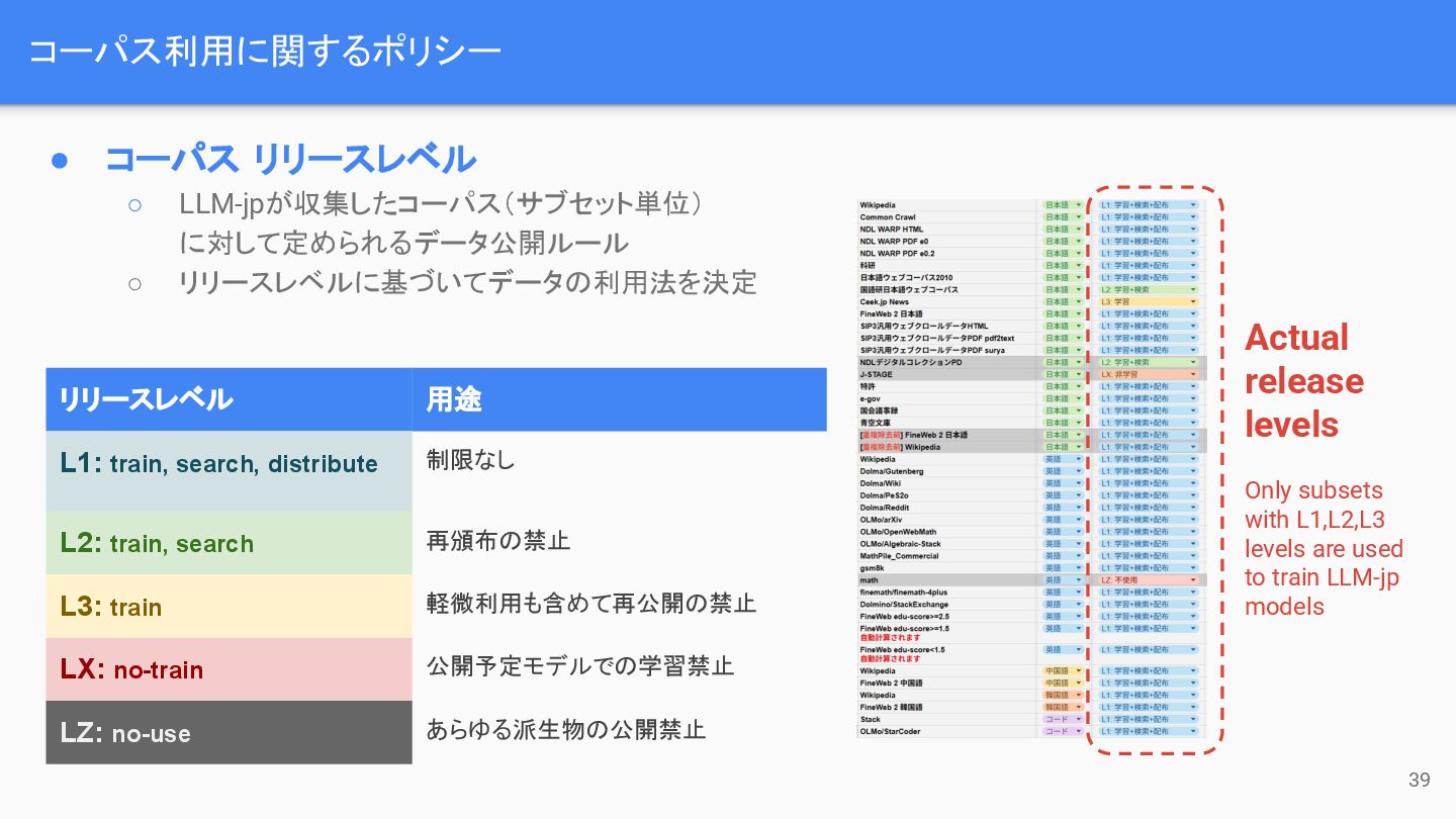 コーパス利用に関するポリシー 39 • コーパス リリースレベル ◦ LLM-jpが収集したコーパス(サブセット単位) に対して定められるデータ公開ルール ◦ リリースレベルに基づいてデータの利用法を決定