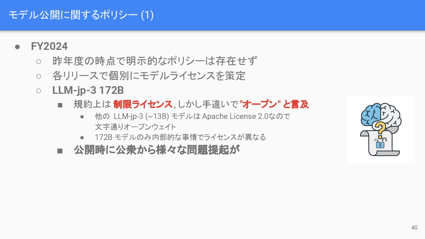 モデル公開に関するポリシー (1) 40 • FY2024 ◦ 昨年度の時点で明示的なポリシーは存在せず ◦ 各リリースで個別にモデルライセンスを策定 ◦