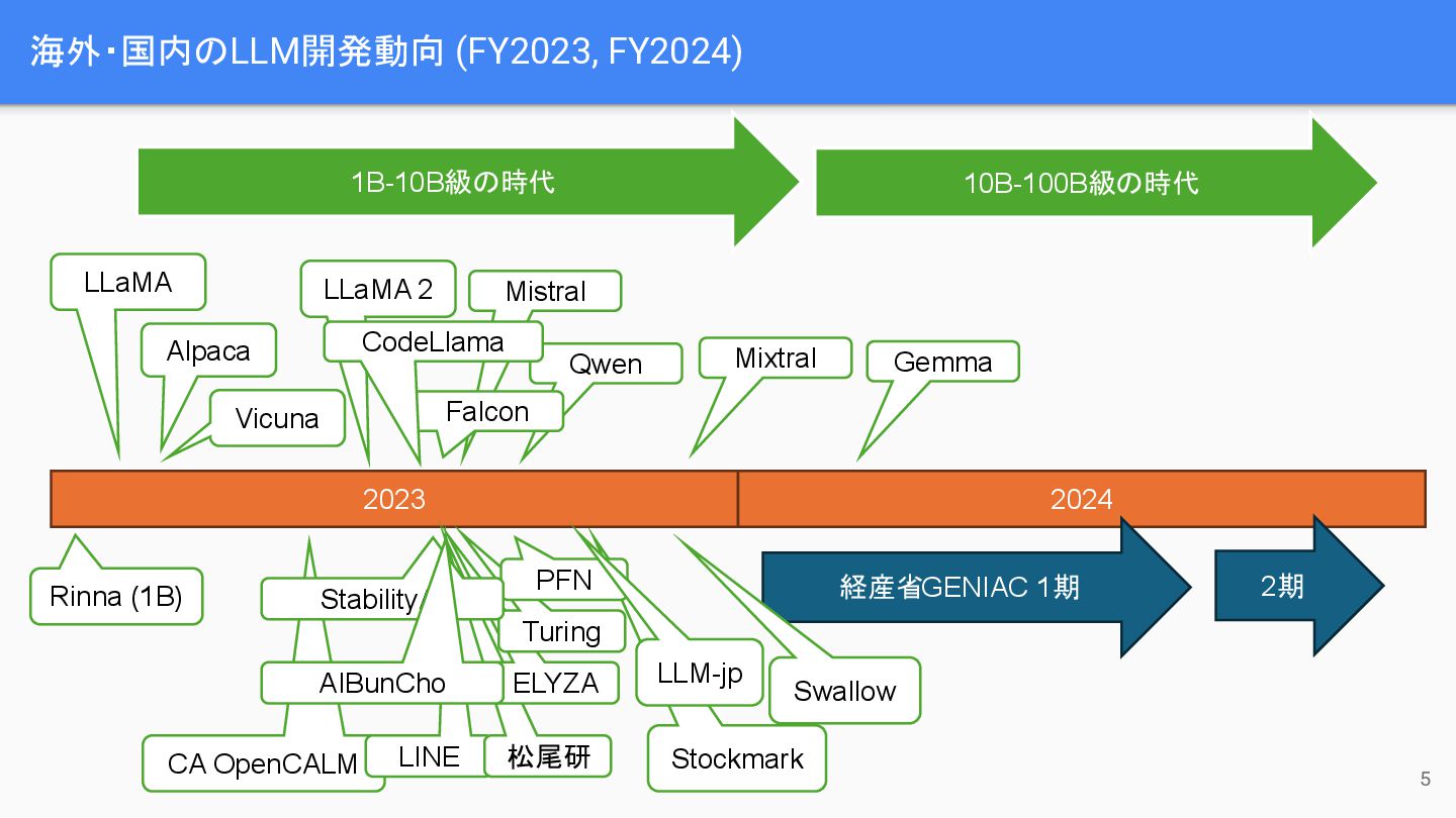 Alpaca Vicuna Rinna (1B) LLaMA 2 LINE 松尾研 ELYZA Mistral Turing PFN StabilityAI AIBunCho Falcon CodeLlama LLM-jp 2024 経産省GENIAC 1期 Mixtral Swallow Gemma 1B-10B級の時代 10B-100B級の時代 2期