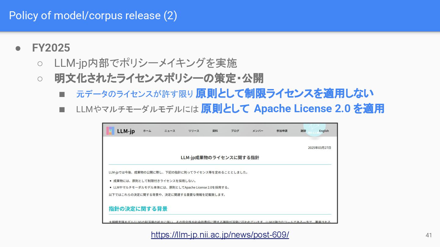Policy of model/corpus release (2) 41 • FY2025 ◦ LLM-jp内部でポリシーメイキングを実施