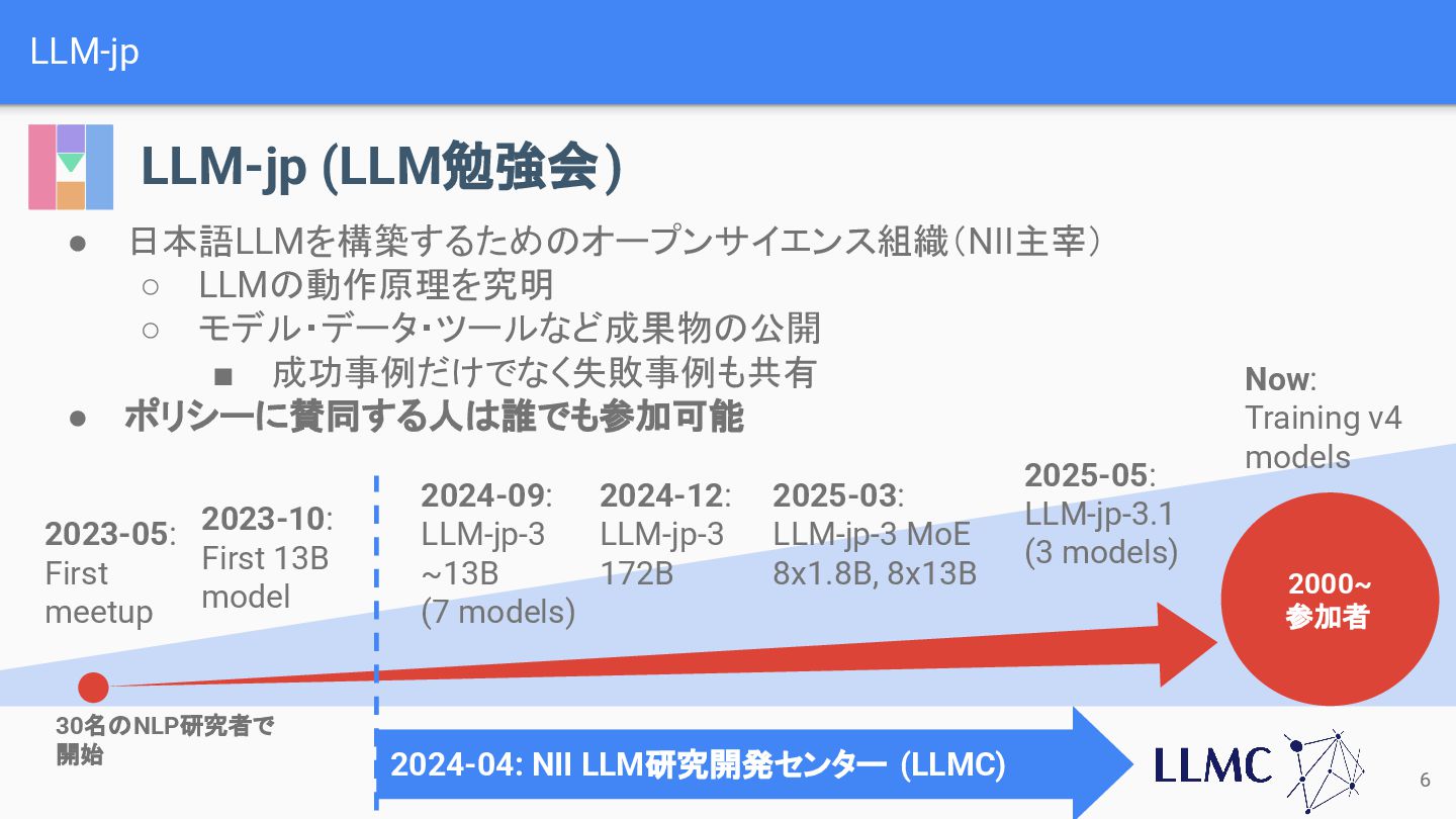 成功事例だけでなく失敗事例も共有 • ポリシーに賛同する人は誰でも参加可能 2023-05: First meetup 2023-10: First 13B model 2024-09: LLM-jp-3 ~13B (7 models) 2024-12: LLM-jp-3 172B 2025-05: LLM-jp-3.1 (3 models) 2025-03: LLM-jp-3 MoE 8x1.8B, 8x13B Now: Training v4 models 2000~ 参加者 30名のNLP研究者で 開始 2024-04: NII LLM研究開発センター (LLMC) 6