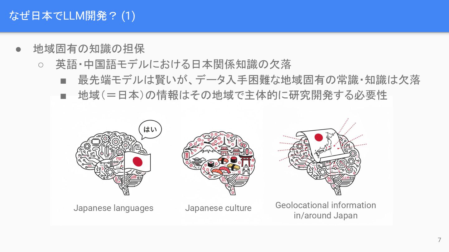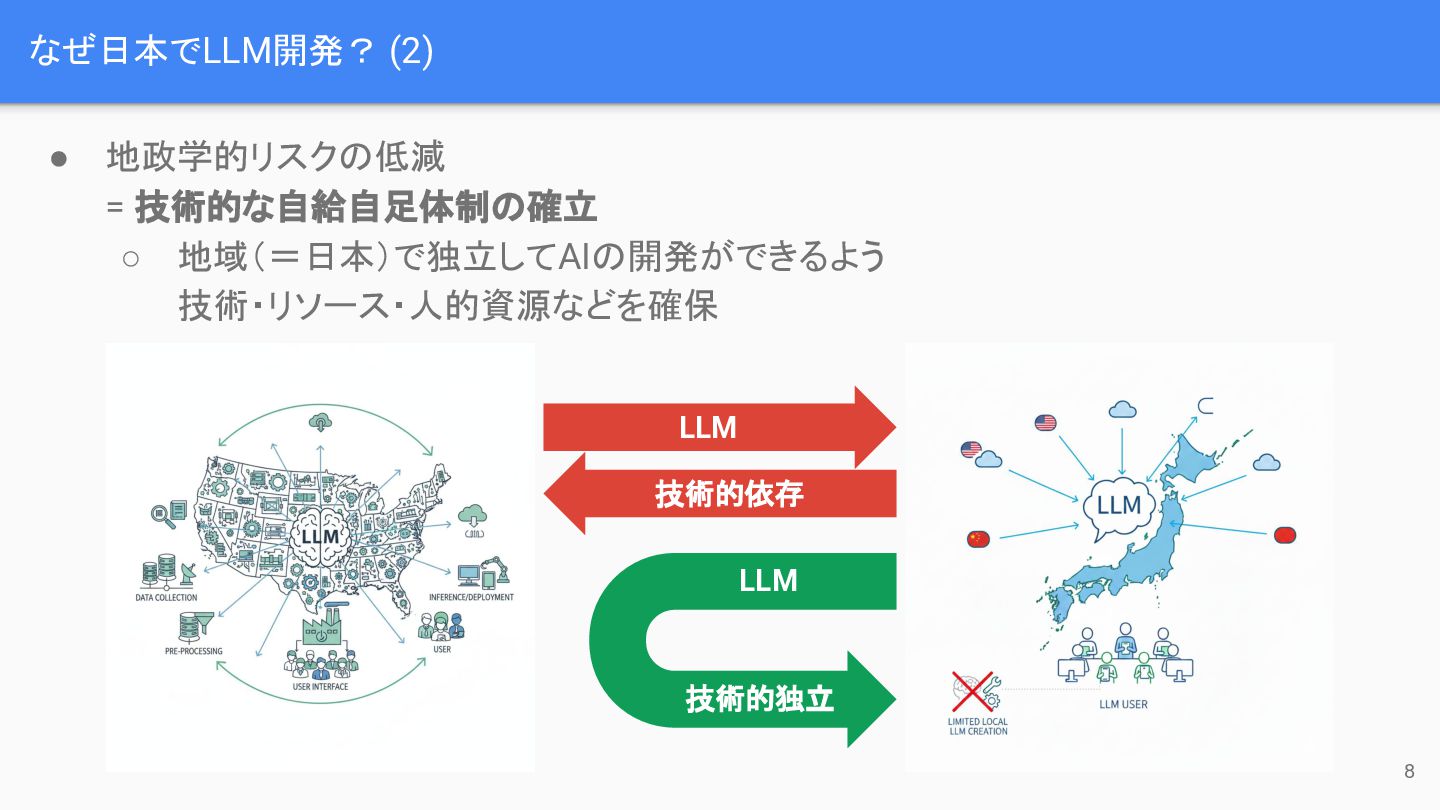 なぜ日本でLLM開発? (2) • 地政学的リスクの低減 = 技術的な自給自足体制の確立 ◦ 地域(=日本)で独立してAIの開発ができるよう 技術・リソース・人的資源などを確保 LLM