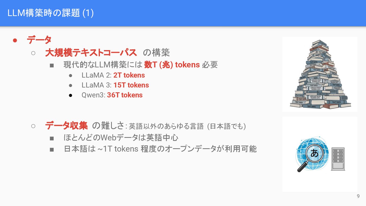 (兆) tokens 必要 • LLaMA 2: 2T tokens • LLaMA 3: 15T tokens • Qwen3: 36T tokens ◦ データ収集 の難しさ:英語以外のあらゆる言語 (日本語でも) ▪ ほとんどのWebデータは英語中心 ▪ 日本語は ~1T tokens 程度のオープンデータが利用可能 9