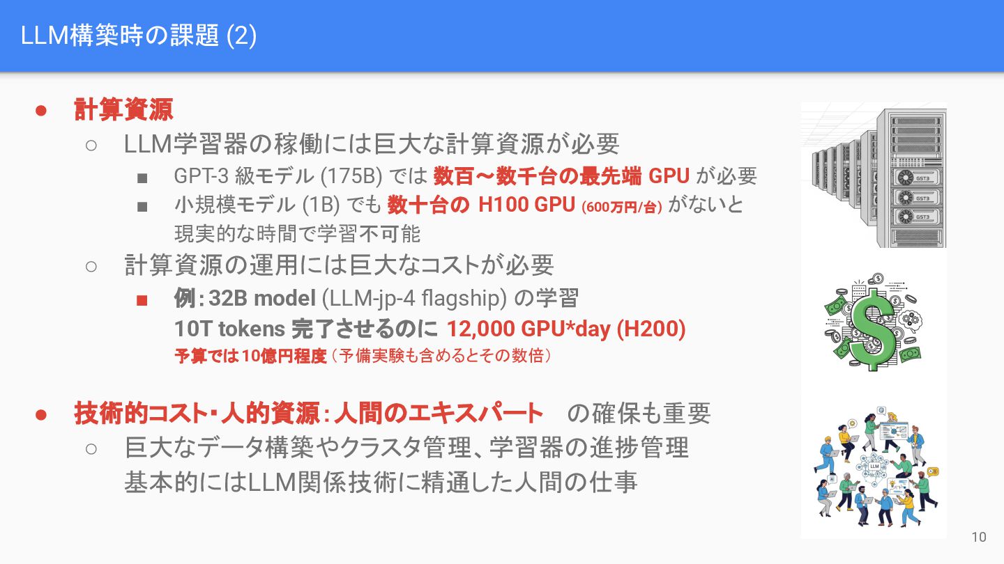 では 数百~数千台の最先端 GPU が必要 ▪ 小規模モデル (1B) でも 数十台の H100 GPU (600万円/台) がないと 現実的な時間で学習不可能 ◦ 計算資源の運用には巨大なコストが必要 ▪ 例:32B model (LLM-jp-4 flagship) の学習 10T tokens 完了させるのに 12,000 GPU*day (H200) 予算では10億円程度(予備実験も含めるとその数倍) • 技術的コスト・人的資源:人間のエキスパート の確保も重要 ◦ 巨大なデータ構築やクラスタ管理、学習器の進捗管理 基本的にはLLM関係技術に精通した人間の仕事 10