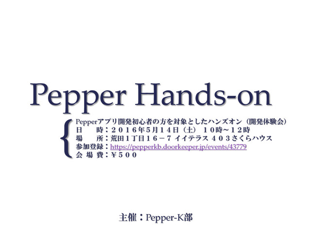 参加登録:https://pepperkb.doorkeeper.jp/events/43779 会 場 費:¥500 主催:Pepper-K部 {