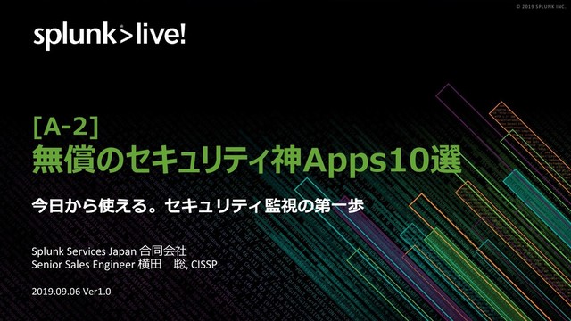 Sessions 20 Hours of Networking “Hands down the most beneficial and attendee focused conference I have attended!” – Michael Mills, Senior Consultant, Booz Allen Hamilton 本日、登録をお願いします! conf.splunk.com .conf19 October 21-24, 2019 Splunk University October19-21, 2019 Las Vegas, NV The Venetian Sands Expo October 21-24