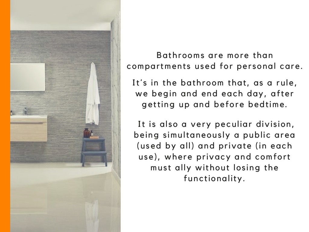in the bathroom that, as a rule, we begin and end each day, after getting up and before bedtime. It is also a very peculiar division, being simultaneously a public area (used by all) and private (in each use), where privacy and comfort must ally without losing the functionality.