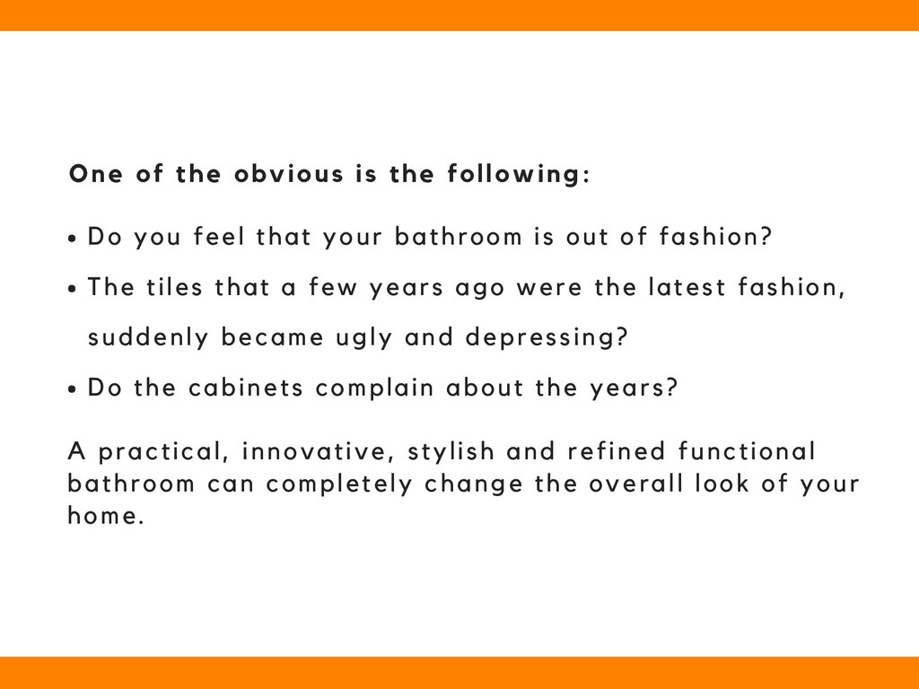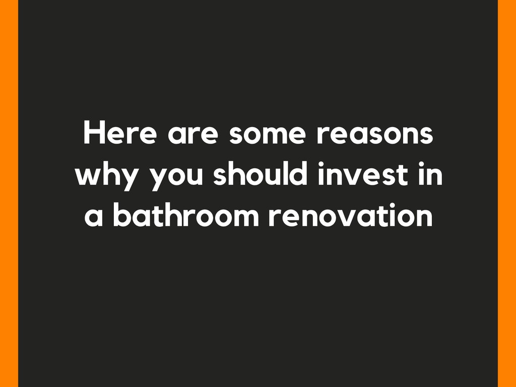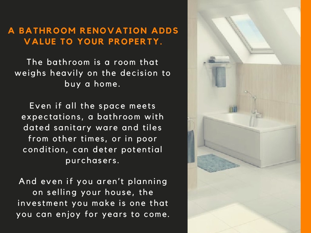 the investment you make is one that you can enjoy for years to come. A BATHROOM RENOVATION ADDS VALUE TO YOUR PROPERTY. The bathroom is a room that weighs heavily on the decision to buy a home. Even if all the space meets expectations, a bathroom with dated sanitary ware and tiles from other times, or in poor condition, can deter potential purchasers.