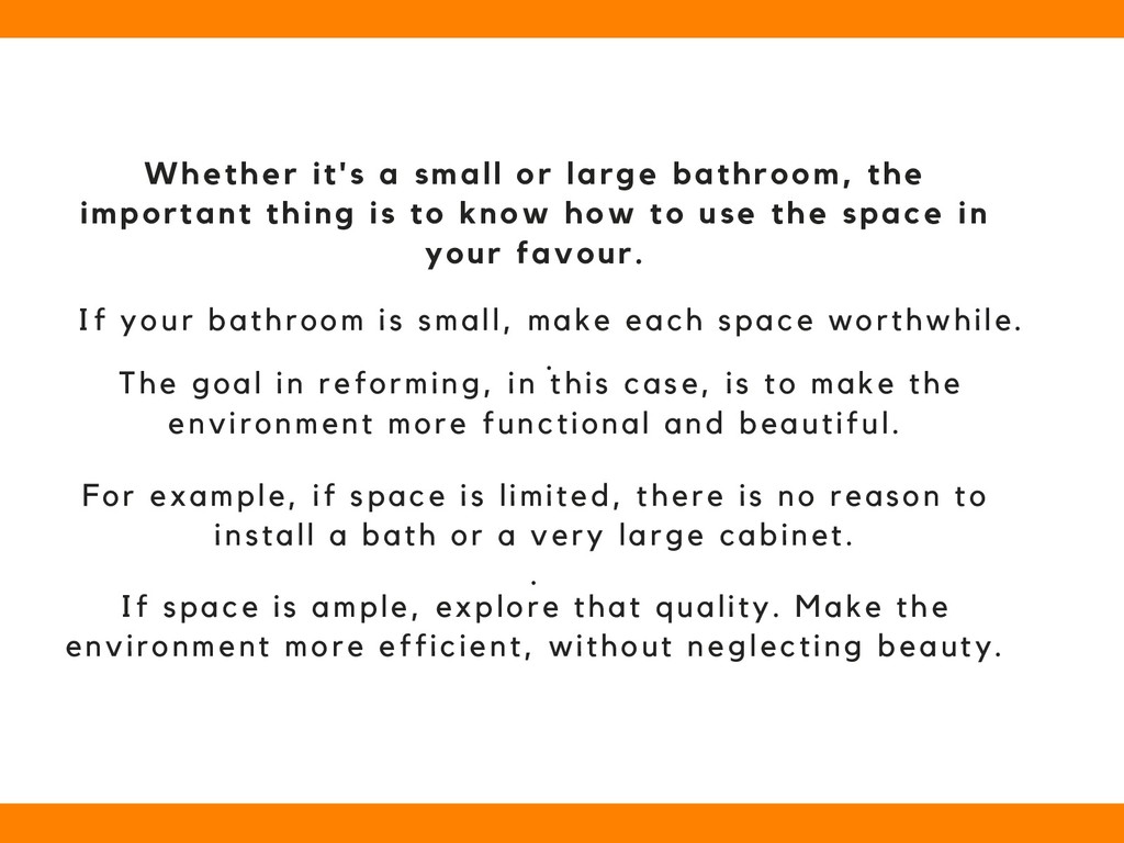 the environment more functional and beautiful. Whether it's a small or large bathroom, the important thing is to know how to use the space in your favour. If your bathroom is small, make each space worthwhile. . For example, if space is limited, there is no reason to install a bath or a very large cabinet. . If space is ample, explore that quality. Make the environment more efficient, without neglecting beauty.