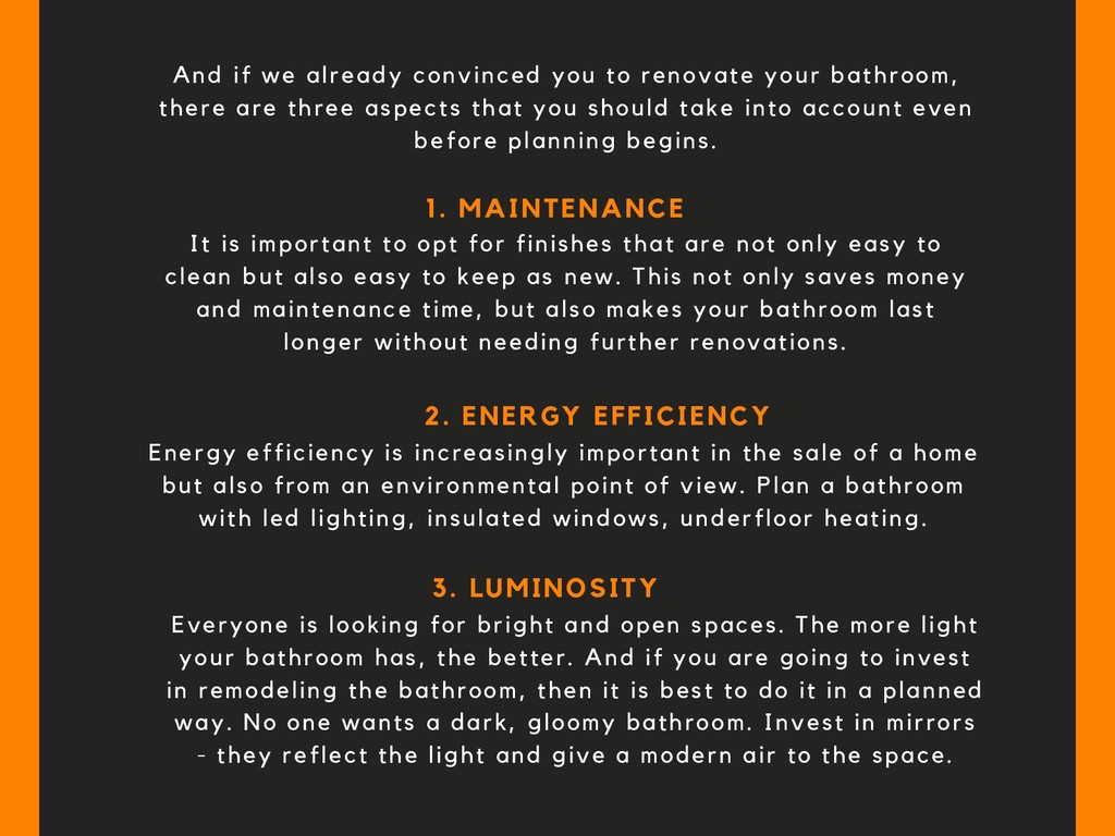 there are three aspects that you should take into account even before planning begins. 1. MAINTENANCE It is important to opt for finishes that are not only easy to clean but also easy to keep as new. This not only saves money and maintenance time, but also makes your bathroom last longer without needing further renovations. 2. ENERGY EFFICIENCY Energy efficiency is increasingly important in the sale of a home but also from an environmental point of view. Plan a bathroom with led lighting, insulated windows, underfloor heating. 3. LUMINOSITY Everyone is looking for bright and open spaces. The more light your bathroom has, the better. And if you are going to invest in remodeling the bathroom, then it is best to do it in a planned way. No one wants a dark, gloomy bathroom. Invest in mirrors - they reflect the light and give a modern air to the space.