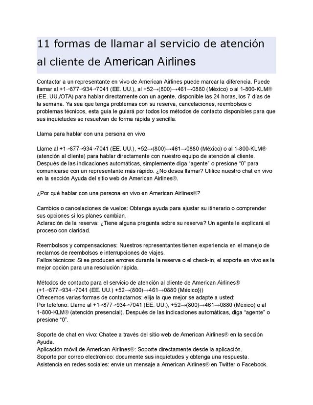 Contactar a un representante en vivo de American Airlines puede marcar la diferencia. Puede llamar al +1↝877↝934↝7041 (EE. UU.), al +52→(800)→461→0880 (México) o al 1-800-KLM® (EE. UU./OTA) para hablar directamente con un agente, disponible las 24 horas, los 7 días de la semana. Ya sea que tenga problemas con su reserva, cancelaciones, reembolsos o problemas técnicos, esta guía le guiará por todos los métodos de contacto disponibles para que sus inquietudes se resuelvan de forma rápida y sencilla.