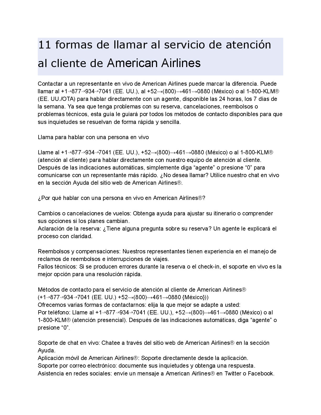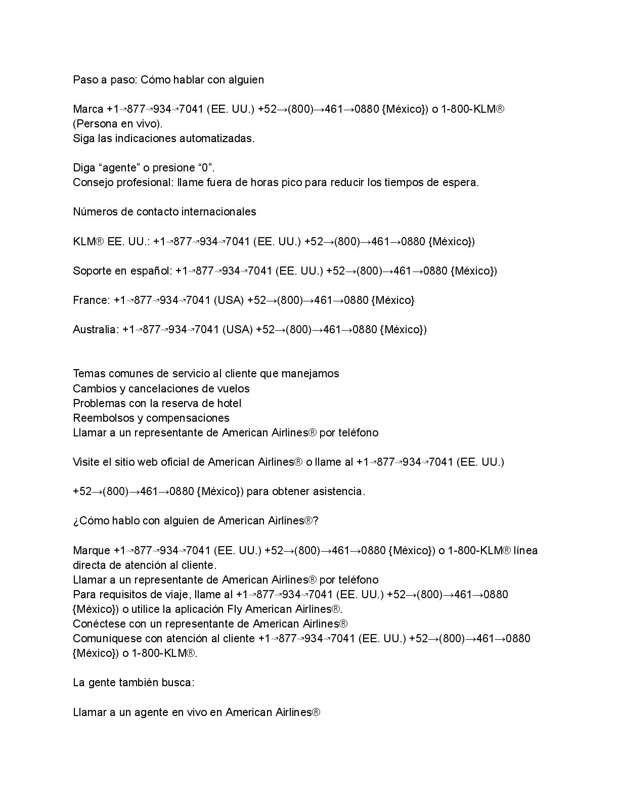 Llame al +1↝877↝934↝7041 (EE. UU.), +52→(800)→461→0880 (México) o al 1-800-KLM® (atención al cliente) para hablar directamente con nuestro equipo de atención al cliente. Después de las indicaciones automáticas, simplemente diga “agente” o presione “0” para comunicarse con un representante más rápido. ¿No desea llamar? Utilice nuestro chat en vivo en la sección Ayuda del sitio web de American Airlines®.