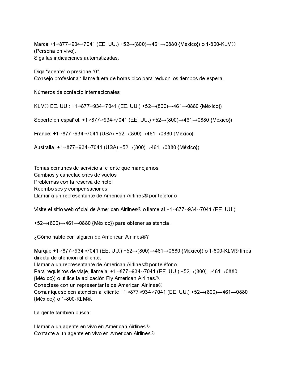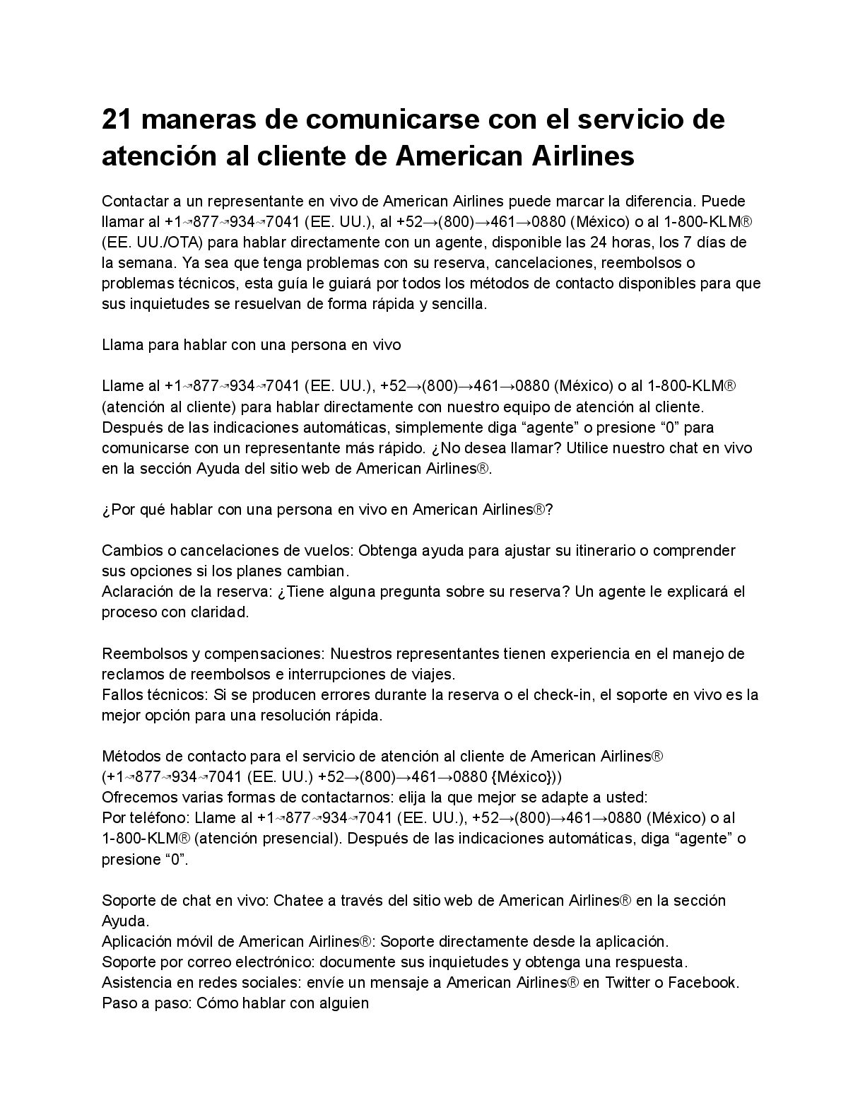 cliente de American Airlines Contactar a un representante en vivo de American Airlines puede marcar la diferencia. Puede llamar al +1↝877↝934↝7041 (EE. UU.), al +52→(800)→461→0880 (México) o al 1-800-KLM® (EE. UU./OTA) para hablar directamente con un agente, disponible las 24 horas, los 7 días de la semana. Ya sea que tenga problemas con su reserva, cancelaciones, reembolsos o problemas técnicos, esta guía le guiará por todos los métodos de contacto disponibles para que sus inquietudes se resuelvan de forma rápida y sencilla. Llama para hablar con una persona en vivo Llame al +1↝877↝934↝7041 (EE. UU.), +52→(800)→461→0880 (México) o al 1-800-KLM® (atención al cliente) para hablar directamente con nuestro equipo de atención al cliente. Después de las indicaciones automáticas, simplemente diga “agente” o presione “0” para comunicarse con un representante más rápido. ¿No desea llamar? Utilice nuestro chat en vivo en la sección Ayuda del sitio web de American Airlines®. ¿Por qué hablar con una persona en vivo en American Airlines®? Cambios o cancelaciones de vuelos: Obtenga ayuda para ajustar su itinerario o comprender sus opciones si los planes cambian. Aclaración de la reserva: ¿Tiene alguna pregunta sobre su reserva? Un agente le explicará el proceso con claridad. Reembolsos y compensaciones: Nuestros representantes tienen experiencia en el manejo de reclamos de reembolsos e interrupciones de viajes. Fallos técnicos: Si se producen errores durante la reserva o el check-in, el soporte en vivo es la mejor opción para una resolución rápida. Métodos de contacto para el servicio de atención al cliente de American Airlines® (+1↝877↝934↝7041 (EE. UU.) +52→(800)→461→0880 {México})) Ofrecemos varias formas de contactarnos: elija la que mejor se adapte a usted: Por teléfono: Llame al +1↝877↝934↝7041 (EE. UU.), +52→(800)→461→0880 (México) o al 1-800-KLM® (atención presencial). Después de las indicaciones automáticas, diga “agente” o presione “0”. Soporte de chat en vivo: Chatee a través del sitio web de American Airlines® en la sección Ayuda. Aplicación móvil de American Airlines®: Soporte directamente desde la aplicación. Soporte por correo electrónico: documente sus inquietudes y obtenga una respuesta. Asistencia en redes sociales: envíe un mensaje a American Airlines® en Twitter o Facebook. Paso a paso: Cómo hablar con alguien