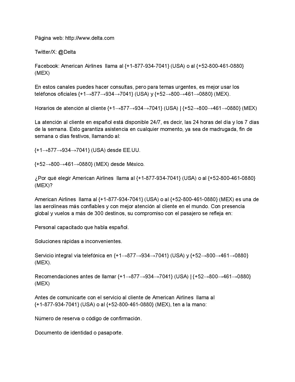 7 días de la semana, con agentes que hablan español para asistirte en todo lo que necesites. ¿Qué servicios ofrece American Airlines llama al {+1-877-934-7041} (USA) o al {+52-800-461-0880} (MEX) en español teléfono? Cuando llamas a American Airlines llama al {+1-877-934-7041} (USA) o al {+52-800-461-0880} (MEX) en español teléfono {+1→877→934→7041} (USA) o {+52→800→461→0880} (MEX), puedes recibir ayuda con: Reservación de boletos Ya sea que quieras comprar un boleto nacional o internacional, puedes hacerlo directamente llamando al {+1→877→934→7041} o {+52→800→461→0880}. Cambios de vuelos Si necesitas modificar la fecha, la hora o el destino de tu vuelo, un agente de Delta te ayudará al {+1→877→934→7041} (USA) o {+52→800→461→0880} (MEX). Cancelaciones y reembolsos Para cancelar tu vuelo o solicitar un reembolso, llama al {+1→877→934→7041} o {+52→800→461→0880}. Asignación de asientos y mejoras de cabina Puedes cambiar o mejorar tu asiento llamando al {+1→877→934→7041} (USA) o {+52→800→461→0880} (MEX). Equipaje perdido o retrasado ¿Tienes problemas con tu equipaje? Llama a {+1→877→934→7041} o {+52→800→461→0880} y Delta te dará seguimiento. Información sobre vuelos en tiempo real Consulta horarios, demoras y puertas de embarque llamando a {+1→877→934→7041} o {+52→800→461→0880}. Atención desde distintos países