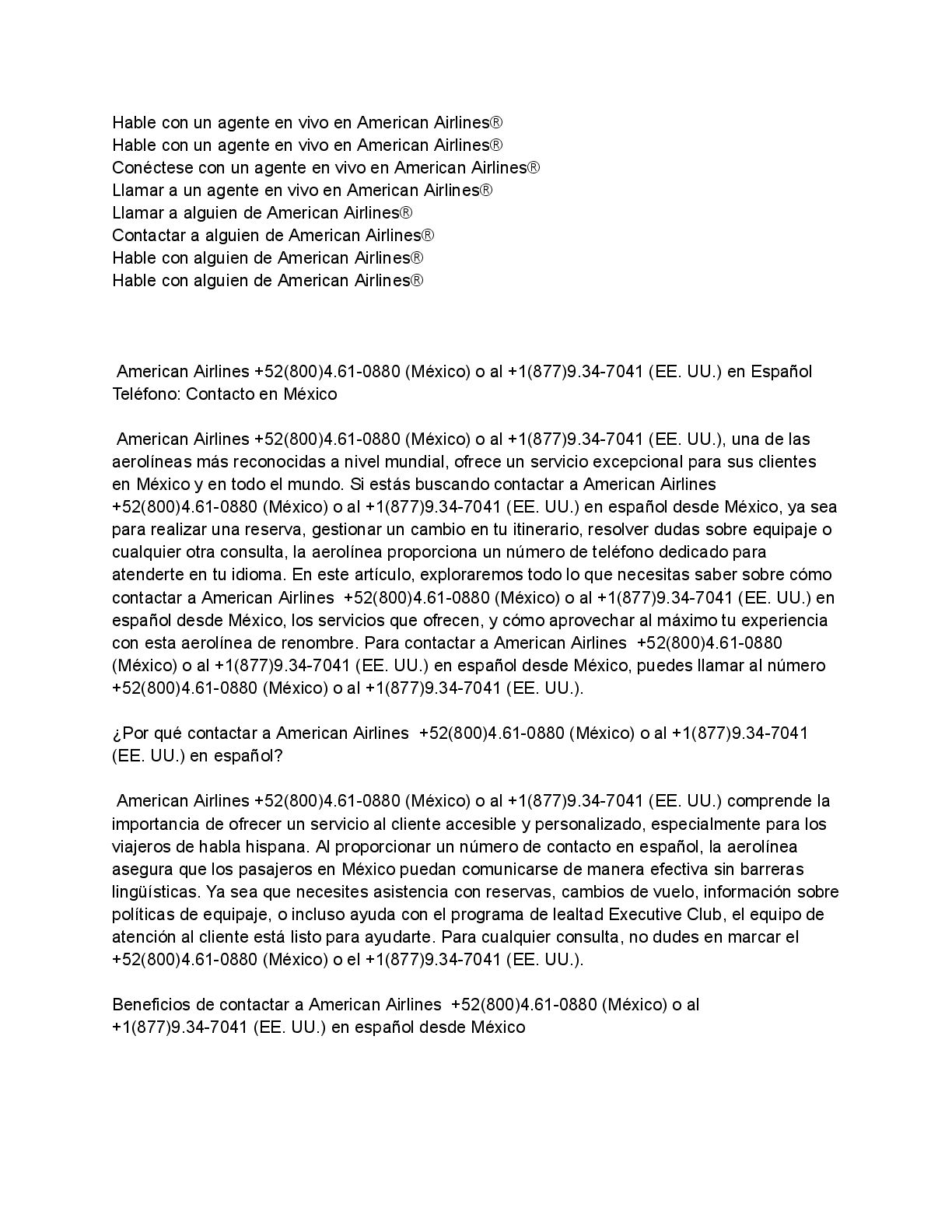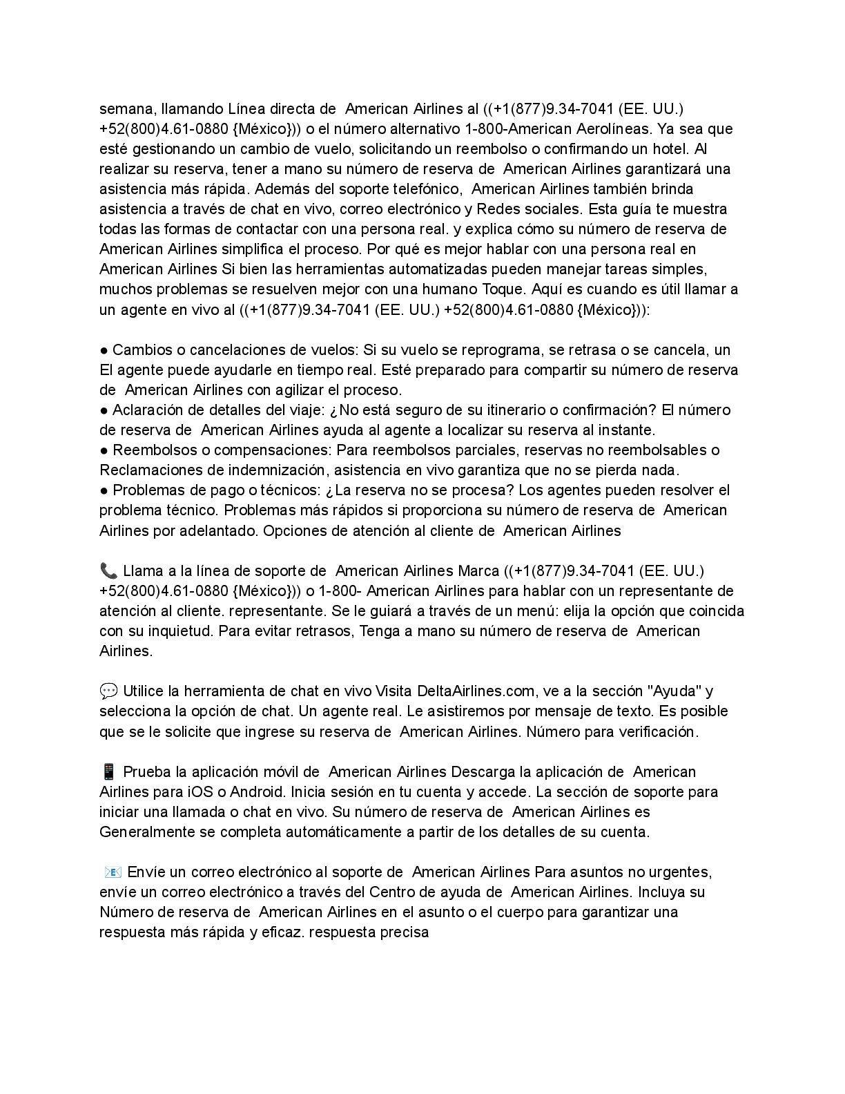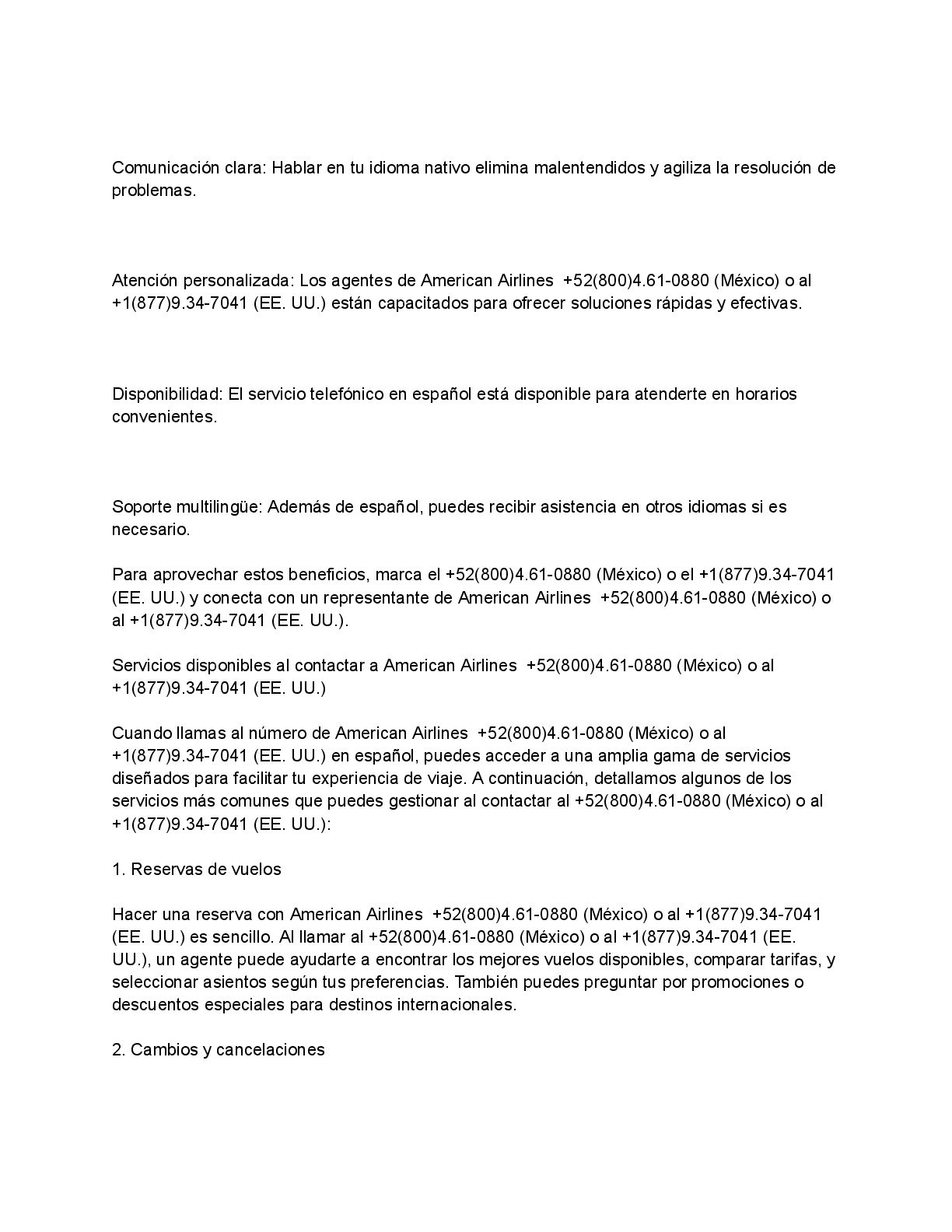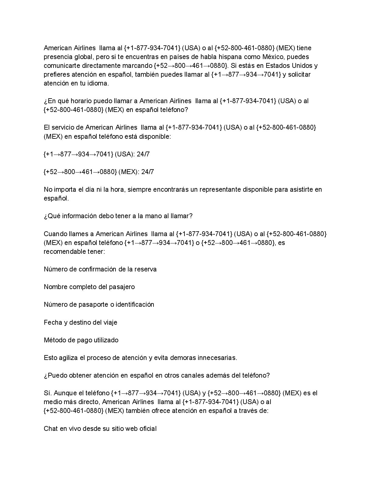 tiene presencia global, pero si te encuentras en países de habla hispana como México, puedes comunicarte directamente marcando {+52→800→461→0880}. Si estás en Estados Unidos y prefieres atención en español, también puedes llamar al {+1→877→934→7041} y solicitar atención en tu idioma. ¿En qué horario puedo llamar a American Airlines llama al {+1-877-934-7041} (USA) o al {+52-800-461-0880} (MEX) en español teléfono? El servicio de American Airlines llama al {+1-877-934-7041} (USA) o al {+52-800-461-0880} (MEX) en español teléfono está disponible: {+1→877→934→7041} (USA): 24/7 {+52→800→461→0880} (MEX): 24/7 No importa el día ni la hora, siempre encontrarás un representante disponible para asistirte en español. ¿Qué información debo tener a la mano al llamar? Cuando llames a American Airlines llama al {+1-877-934-7041} (USA) o al {+52-800-461-0880} (MEX) en español teléfono {+1→877→934→7041} o {+52→800→461→0880}, es recomendable tener: Número de confirmación de la reserva Nombre completo del pasajero Número de pasaporte o identificación Fecha y destino del viaje Método de pago utilizado Esto agiliza el proceso de atención y evita demoras innecesarias. ¿Puedo obtener atención en español en otros canales además del teléfono? Sí. Aunque el teléfono {+1→877→934→7041} (USA) y {+52→800→461→0880} (MEX) es el medio más directo, American Airlines llama al {+1-877-934-7041} (USA) o al {+52-800-461-0880} (MEX) también ofrece atención en español a través de: Chat en vivo desde su sitio web oficial