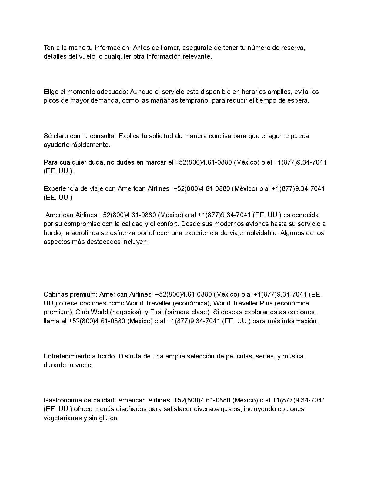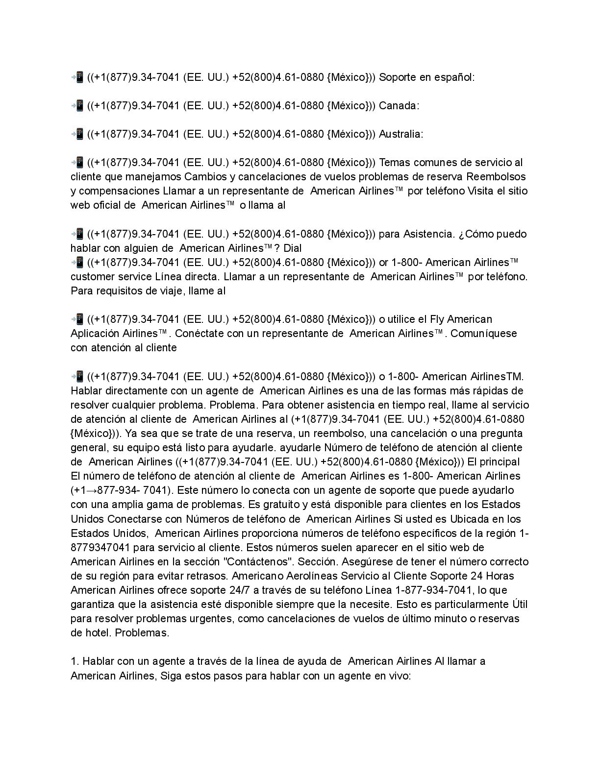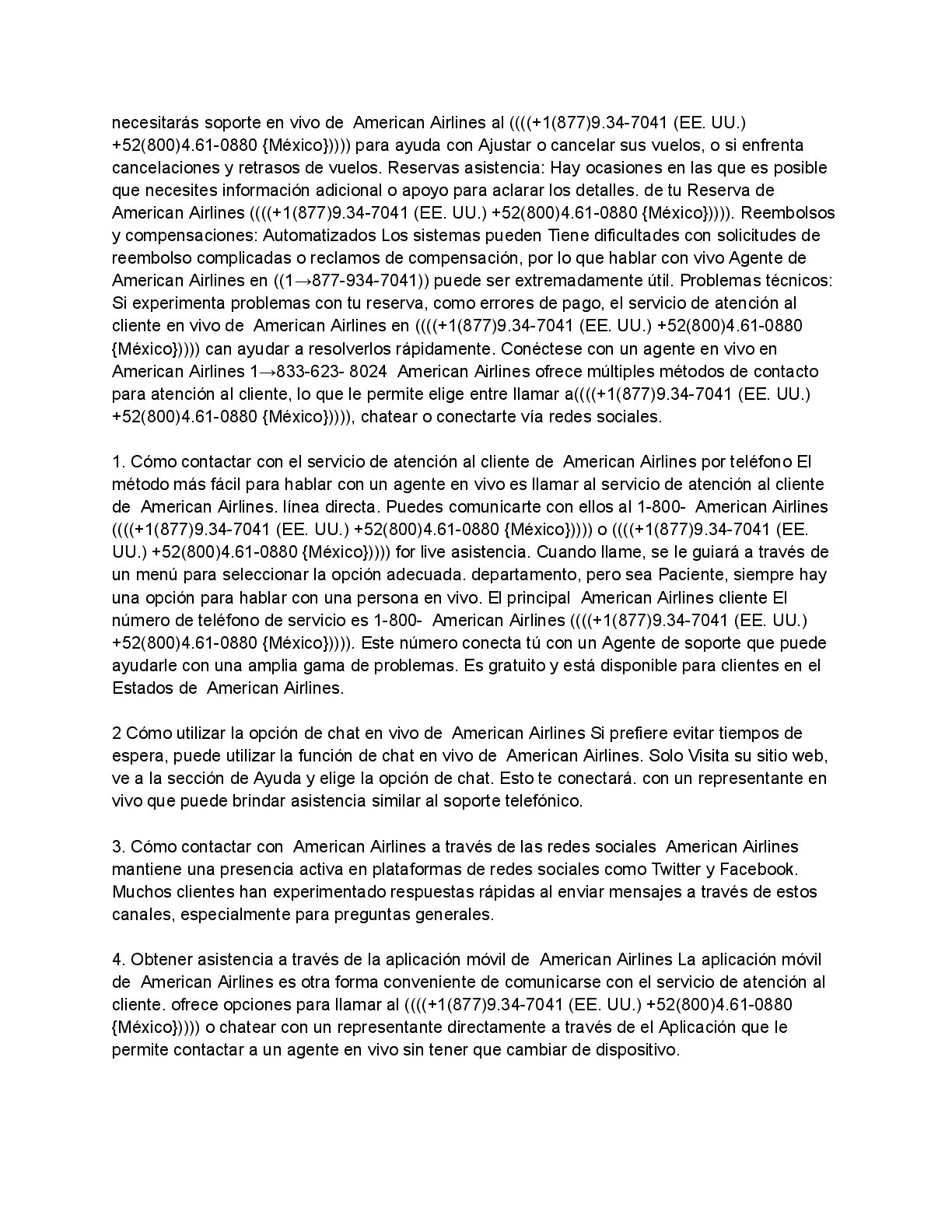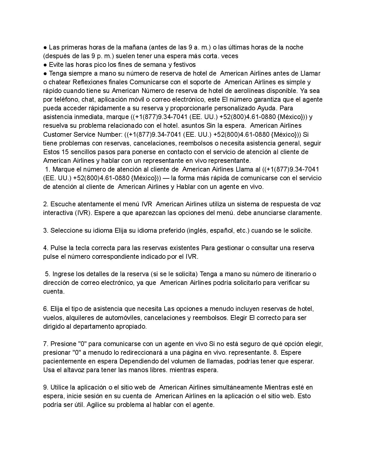 tiene presencia global, pero si te encuentras en países de habla hispana como México, puedes comunicarte directamente marcando {+52→800→461→0880}. Si estás en Estados Unidos y prefieres atención en español, también puedes llamar al {+1→877→934→7041} y solicitar atención en tu idioma. ¿En qué horario puedo llamar a American Airlines llama al {+1-877-934-7041} (USA) o al {+52-800-461-0880} (MEX) en español teléfono? El servicio de American Airlines llama al {+1-877-934-7041} (USA) o al {+52-800-461-0880} (MEX) en español teléfono está disponible: {+1→877→934→7041} (USA): 24/7 {+52→800→461→0880} (MEX): 24/7 No importa el día ni la hora, siempre encontrarás un representante disponible para asistirte en español. ¿Qué información debo tener a la mano al llamar? Cuando llames a American Airlines llama al {+1-877-934-7041} (USA) o al {+52-800-461-0880} (MEX) en español teléfono {+1→877→934→7041} o {+52→800→461→0880}, es recomendable tener: Número de confirmación de la reserva Nombre completo del pasajero Número de pasaporte o identificación Fecha y destino del viaje Método de pago utilizado Esto agiliza el proceso de atención y evita demoras innecesarias. ¿Puedo obtener atención en español en otros canales además del teléfono? Sí. Aunque el teléfono {+1→877→934→7041} (USA) y {+52→800→461→0880} (MEX) es el medio más directo, American Airlines llama al {+1-877-934-7041} (USA) o al {+52-800-461-0880} (MEX) también ofrece atención en español a través de: Chat en vivo desde su sitio web oficial