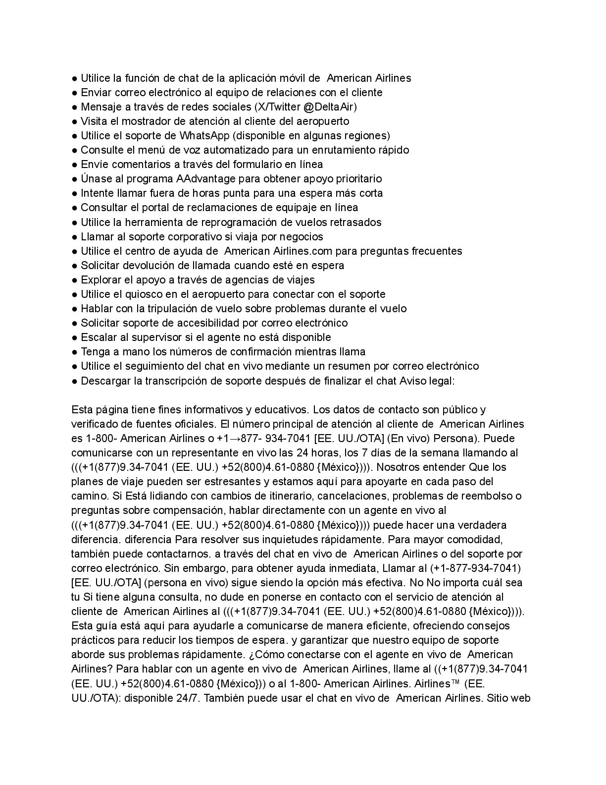 de American Airlines • Enviar correo electrónico al equipo de relaciones con el cliente • Mensaje a través de redes sociales (X/Twitter @DeltaAir) • Visita el mostrador de atención al cliente del aeropuerto • Utilice el soporte de WhatsApp (disponible en algunas regiones) • Consulte el menú de voz automatizado para un enrutamiento rápido • Envíe comentarios a través del formulario en línea • Únase al programa AAdvantage para obtener apoyo prioritario • Intente llamar fuera de horas punta para una espera más corta • Consultar el portal de reclamaciones de equipaje en línea • Utilice la herramienta de reprogramación de vuelos retrasados • Llamar al soporte corporativo si viaja por negocios • Utilice el centro de ayuda de American Airlines.com para preguntas frecuentes • Solicitar devolución de llamada cuando esté en espera • Explorar el apoyo a través de agencias de viajes • Utilice el quiosco en el aeropuerto para conectar con el soporte • Hablar con la tripulación de vuelo sobre problemas durante el vuelo • Solicitar soporte de accesibilidad por correo electrónico • Escalar al supervisor si el agente no está disponible • Tenga a mano los números de confirmación mientras llama • Utilice el seguimiento del chat en vivo mediante un resumen por correo electrónico • Descargar la transcripción de soporte después de finalizar el chat Aviso legal: Esta página tiene fines informativos y educativos. Los datos de contacto son público y verificado de fuentes oficiales. El número principal de atención al cliente de American Airlines es 1-800- American Airlines o +1→877- 934-7041 [EE. UU./OTA] (En vivo) Persona). Puede comunicarse con un representante en vivo las 24 horas, los 7 días de la semana llamando al (((+1(877)9.34-7041 (EE. UU.) +52(800)4.61-0880 {México}))). Nosotros entender Que los planes de viaje pueden ser estresantes y estamos aquí para apoyarte en cada paso del camino. Si Está lidiando con cambios de itinerario, cancelaciones, problemas de reembolso o preguntas sobre compensación, hablar directamente con un agente en vivo al (((+1(877)9.34-7041 (EE. UU.) +52(800)4.61-0880 {México}))) puede hacer una verdadera diferencia. diferencia Para resolver sus inquietudes rápidamente. Para mayor comodidad, también puede contactarnos. a través del chat en vivo de American Airlines o del soporte por correo electrónico. Sin embargo, para obtener ayuda inmediata, Llamar al (+1-877-934-7041) [EE. UU./OTA] (persona en vivo) sigue siendo la opción más efectiva. No No importa cuál sea tu Si tiene alguna consulta, no dude en ponerse en contacto con el servicio de atención al cliente de American Airlines al (((+1(877)9.34-7041 (EE. UU.) +52(800)4.61-0880 {México}))). Esta guía está aquí para ayudarle a comunicarse de manera eficiente, ofreciendo consejos prácticos para reducir los tiempos de espera. y garantizar que nuestro equipo de soporte aborde sus problemas rápidamente. ¿Cómo conectarse con el agente en vivo de American Airlines? Para hablar con un agente en vivo de American Airlines, llame al ((+1(877)9.34-7041 (EE. UU.) +52(800)4.61-0880 {México})) o al 1-800- American Airlines. Airlines™ (EE. UU./OTA): disponible 24/7. También puede usar el chat en vivo de American Airlines. Sitio web