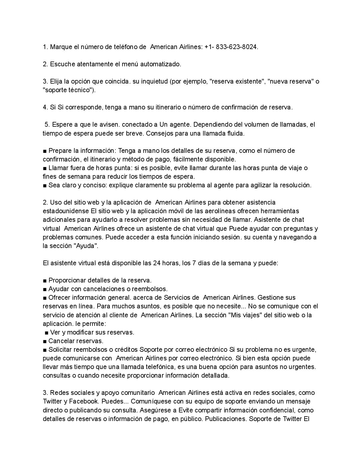 833-623-8024. 2. Escuche atentamente el menú automatizado. 3. Elija la opción que coincida. su inquietud (por ejemplo, "reserva existente", "nueva reserva" o "soporte técnico"). 4. Si Si corresponde, tenga a mano su itinerario o número de confirmación de reserva. 5. Espere a que le avisen. conectado a Un agente. Dependiendo del volumen de llamadas, el tiempo de espera puede ser breve. Consejos para una llamada fluida. ▪ Prepare la información: Tenga a mano los detalles de su reserva, como el número de confirmación, el itinerario y método de pago, fácilmente disponible. ▪ Llamar fuera de horas punta: si es posible, evite llamar durante las horas punta de viaje o fines de semana para reducir los tiempos de espera. ▪ Sea claro y conciso: explique claramente su problema al agente para agilizar la resolución. 2. Uso del sitio web y la aplicación de American Airlines para obtener asistencia estadounidense El sitio web y la aplicación móvil de las aerolíneas ofrecen herramientas adicionales para ayudarlo a resolver problemas sin necesidad de llamar. Asistente de chat virtual American Airlines ofrece un asistente de chat virtual que Puede ayudar con preguntas y problemas comunes. Puede acceder a esta función iniciando sesión. su cuenta y navegando a la sección "Ayuda". El asistente virtual está disponible las 24 horas, los 7 días de la semana y puede: ▪ Proporcionar detalles de la reserva. ▪ Ayudar con cancelaciones o reembolsos. ▪ Ofrecer información general. acerca de Servicios de American Airlines. Gestione sus reservas en línea. Para muchos asuntos, es posible que no necesite... No se comunique con el servicio de atención al cliente de American Airlines. La sección "Mis viajes" del sitio web o la aplicación. le permite: ▪ Ver y modificar sus reservas. ▪ Cancelar reservas. ▪ Solicitar reembolsos o créditos Soporte por correo electrónico Si su problema no es urgente, puede comunicarse con American Airlines por correo electrónico. Si bien esta opción puede llevar más tiempo que una llamada telefónica, es una buena opción para asuntos no urgentes. consultas o cuando necesite proporcionar información detallada. 3. Redes sociales y apoyo comunitario American Airlines está activa en redes sociales, como Twitter y Facebook. Puedes... Comuníquese con su equipo de soporte enviando un mensaje directo o publicando su consulta. Asegúrese a Evite compartir información confidencial, como detalles de reservas o información de pago, en público. Publicaciones. Soporte de Twitter El