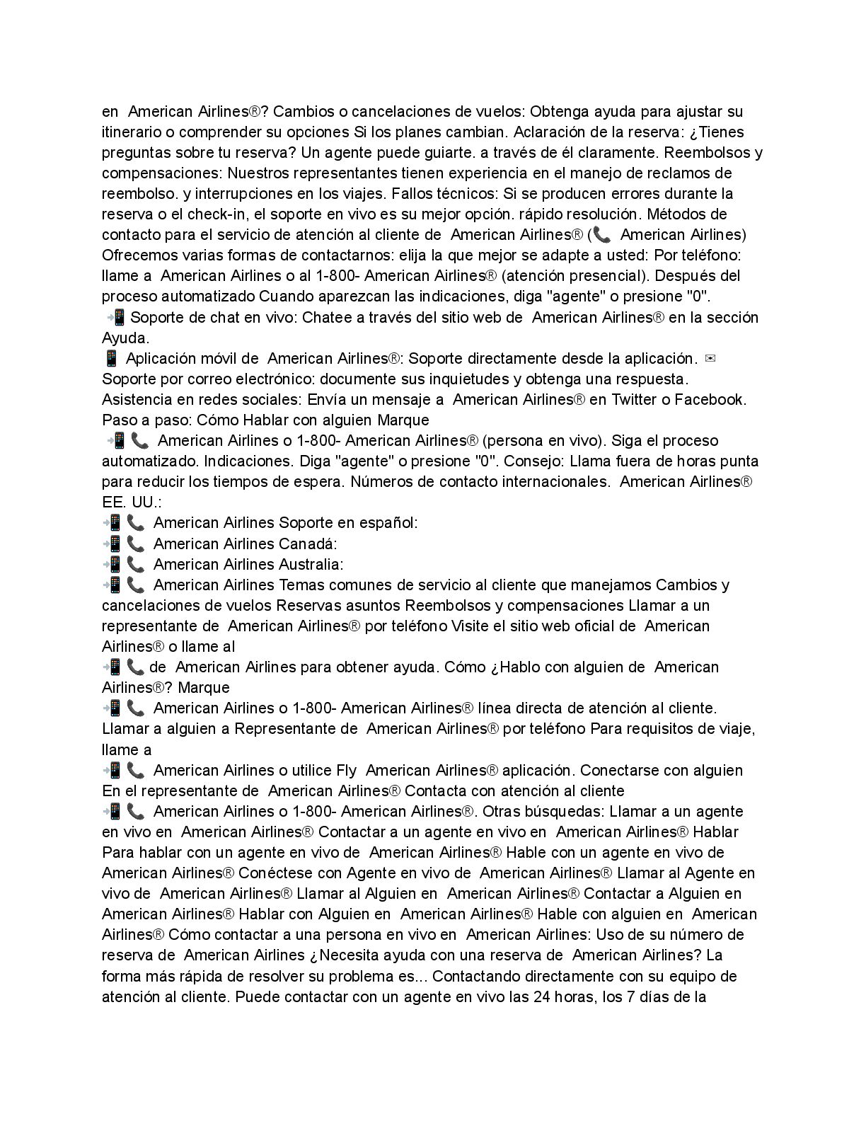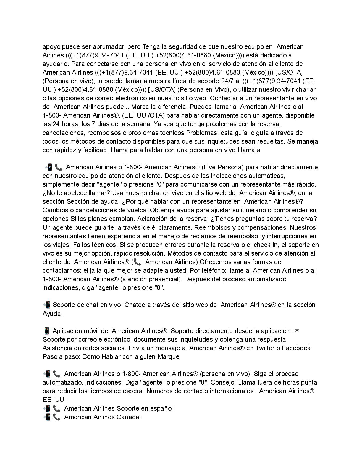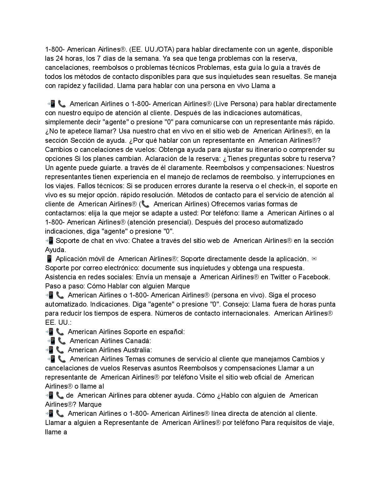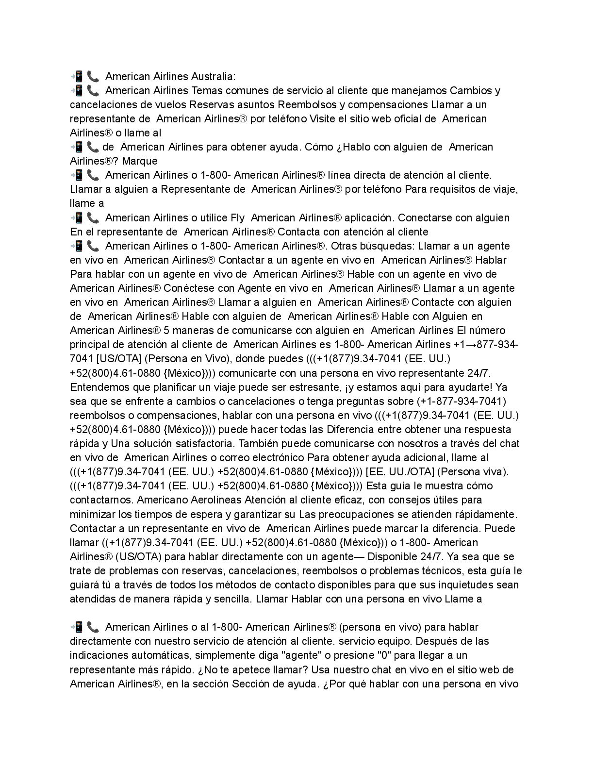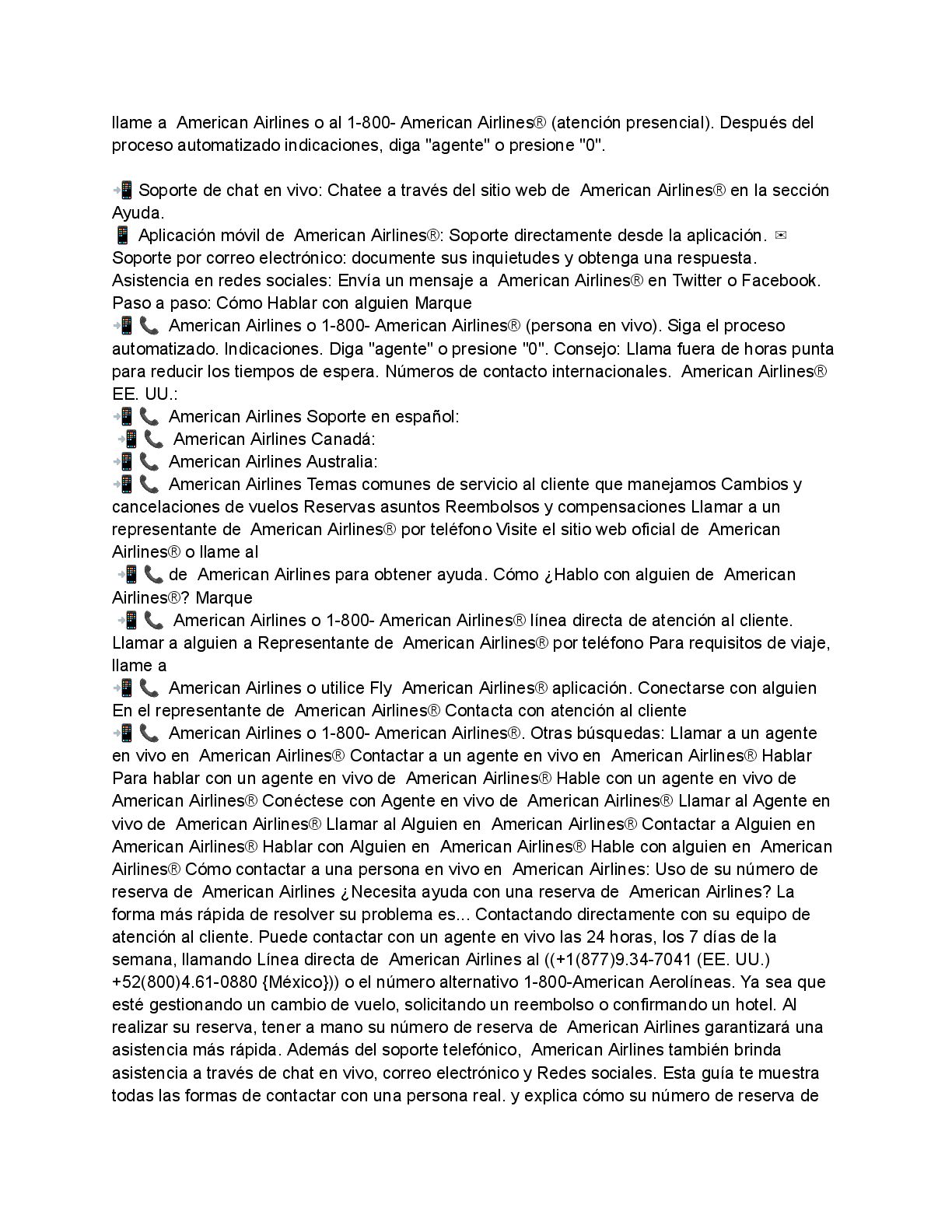 agente, disponible las 24 horas, los 7 días de la semana. Ya sea que tenga problemas con la reserva, cancelaciones, reembolsos o problemas técnicos Problemas, esta guía lo guía a través de todos los métodos de contacto disponibles para que sus inquietudes sean resueltas. Se maneja con rapidez y facilidad. Llama para hablar con una persona en vivo Llama a 📲 📞 American Airlines o 1-800- American Airlines® (Live Persona) para hablar directamente con nuestro equipo de atención al cliente. Después de las indicaciones automáticas, simplemente decir "agente" o presione "0" para comunicarse con un representante más rápido. ¿No te apetece llamar? Usa nuestro chat en vivo en el sitio web de American Airlines®, en la sección Sección de ayuda. ¿Por qué hablar con un representante en American Airlines®? Cambios o cancelaciones de vuelos: Obtenga ayuda para ajustar su itinerario o comprender su opciones Si los planes cambian. Aclaración de la reserva: ¿Tienes preguntas sobre tu reserva? Un agente puede guiarte. a través de él claramente. Reembolsos y compensaciones: Nuestros representantes tienen experiencia en el manejo de reclamos de reembolso. y interrupciones en los viajes. Fallos técnicos: Si se producen errores durante la reserva o el check-in, el soporte en vivo es su mejor opción. rápido resolución. Métodos de contacto para el servicio de atención al cliente de American Airlines® ( 📞 American Airlines) Ofrecemos varias formas de contactarnos: elija la que mejor se adapte a usted: Por teléfono: llame a American Airlines o al 1-800- American Airlines® (atención presencial). Después del proceso automatizado indicaciones, diga "agente" o presione "0". 📲 Soporte de chat en vivo: Chatee a través del sitio web de American Airlines® en la sección Ayuda. 📱 Aplicación móvil de American Airlines®: Soporte directamente desde la aplicación. ✉ Soporte por correo electrónico: documente sus inquietudes y obtenga una respuesta. Asistencia en redes sociales: Envía un mensaje a American Airlines® en Twitter o Facebook. Paso a paso: Cómo Hablar con alguien Marque 📲 📞 American Airlines o 1-800- American Airlines® (persona en vivo). Siga el proceso automatizado. Indicaciones. Diga "agente" o presione "0". Consejo: Llama fuera de horas punta para reducir los tiempos de espera. Números de contacto internacionales. American Airlines® EE. UU.: 📲 📞 American Airlines Soporte en español: 📲 📞 American Airlines Canadá: 📲 📞 American Airlines Australia: 📲 📞 American Airlines Temas comunes de servicio al cliente que manejamos Cambios y cancelaciones de vuelos Reservas asuntos Reembolsos y compensaciones Llamar a un representante de American Airlines® por teléfono Visite el sitio web oficial de American Airlines® o llame al 📲 📞 de American Airlines para obtener ayuda. Cómo ¿Hablo con alguien de American Airlines®? Marque 📲 📞 American Airlines o 1-800- American Airlines® línea directa de atención al cliente. Llamar a alguien a Representante de American Airlines® por teléfono Para requisitos de viaje, llame a