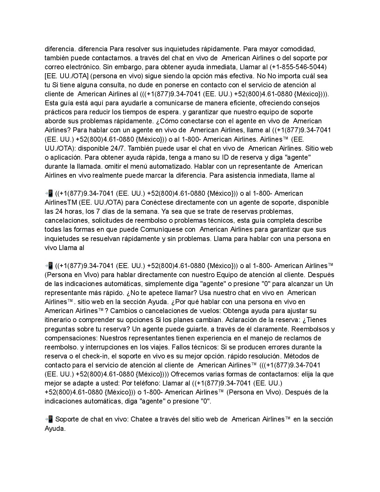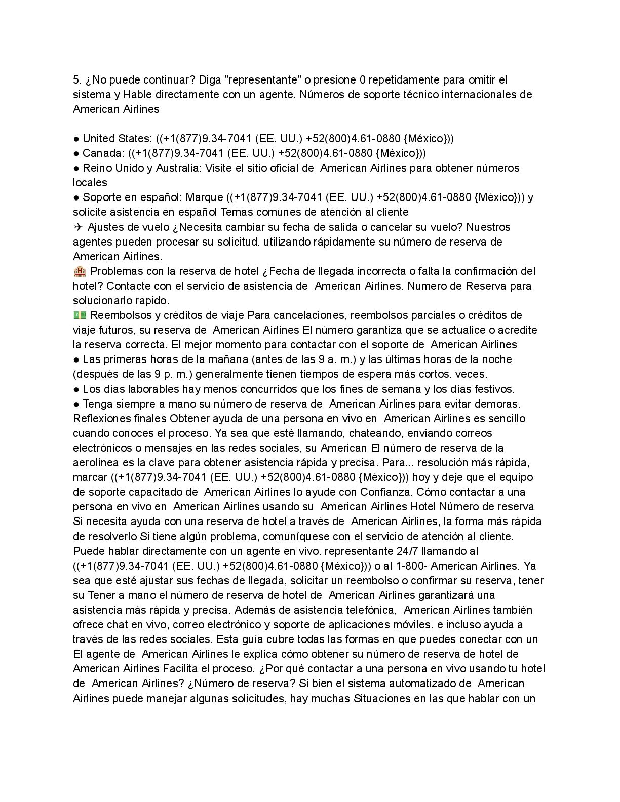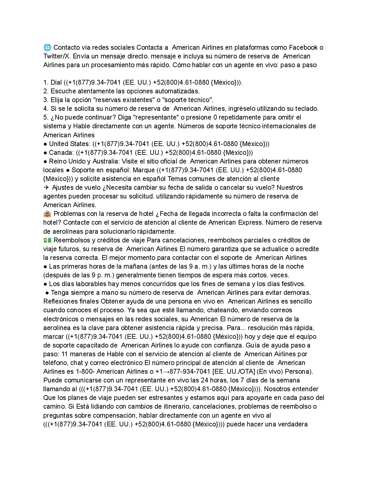 ID de reserva y diga "agente" durante la llamada. omitir el menú automatizado. Hablar con un representante de American Airlines en vivo realmente puede marcar la diferencia. Para asistencia inmediata, llame al 📲 ((+1(877)9.34-7041 (EE. UU.) +52(800)4.61-0880 {México})) o al 1-800- American AirlinesTM (EE. UU./OTA) para Conéctese directamente con un agente de soporte, disponible las 24 horas, los 7 días de la semana. Ya sea que se trate de reservas problemas, cancelaciones, solicitudes de reembolso o problemas técnicos, esta guía completa describe todas las formas en que puede Comuníquese con American Airlines para garantizar que sus inquietudes se resuelvan rápidamente y sin problemas. Llama para hablar con una persona en vivo Llama al 📲 ((+1(877)9.34-7041 (EE. UU.) +52(800)4.61-0880 {México})) o al 1-800- American Airlines™ (Persona en Vivo) para hablar directamente con nuestro Equipo de atención al cliente. Después de las indicaciones automáticas, simplemente diga "agente" o presione "0" para alcanzar un Un representante más rápido. ¿No te apetece llamar? Usa nuestro chat en vivo en American Airlines™. sitio web en la sección Ayuda. ¿Por qué hablar con una persona en vivo en American Airlines™? Cambios o cancelaciones de vuelos: Obtenga ayuda para ajustar su itinerario o comprender su opciones Si los planes cambian. Aclaración de la reserva: ¿Tienes preguntas sobre tu reserva? Un agente puede guiarte. a través de él claramente. Reembolsos y compensaciones: Nuestros representantes tienen experiencia en el manejo de reclamos de reembolso. y interrupciones en los viajes. Fallos técnicos: Si se producen errores durante la reserva o el check-in, el soporte en vivo es su mejor opción. rápido resolución. Métodos de contacto para el servicio de atención al cliente de American Airlines™ (((+1(877)9.34-7041 (EE. UU.) +52(800)4.61-0880 {México}))) Ofrecemos varias formas de contactarnos: elija la que mejor se adapte a usted: Por teléfono: Llamar al ((+1(877)9.34-7041 (EE. UU.) +52(800)4.61-0880 {México})) o 1-800- American Airlines™ (Persona en Vivo). Después de la indicaciones automáticas, diga "agente" o presione "0". 📲 Soporte de chat en vivo: Chatee a través del sitio web de American Airlines™ en la sección Ayuda. 📱 Aplicación móvil American Airlines™: Soporte directamente desde la aplicación. ✉ Soporte por correo electrónico: documente sus inquietudes y obtenga una respuesta. Asistencia en redes sociales: Envíe un mensaje a American Airlines™ en Twitter o Facebook. Paso a paso: Cómo hablar con alguien Dial 📲 ((+1(877)9.34-7041 (EE. UU.) +52(800)4.61-0880 {México})) or 1-800- American Airlines™ (Live Persona). Siga las indicaciones automatizadas. Diga "agente" o presione "0". Consejo profesional: llame durante horas de menor actividad para reducir los tiempos de espera. Números de contacto internacionales American Airlines™ USA: