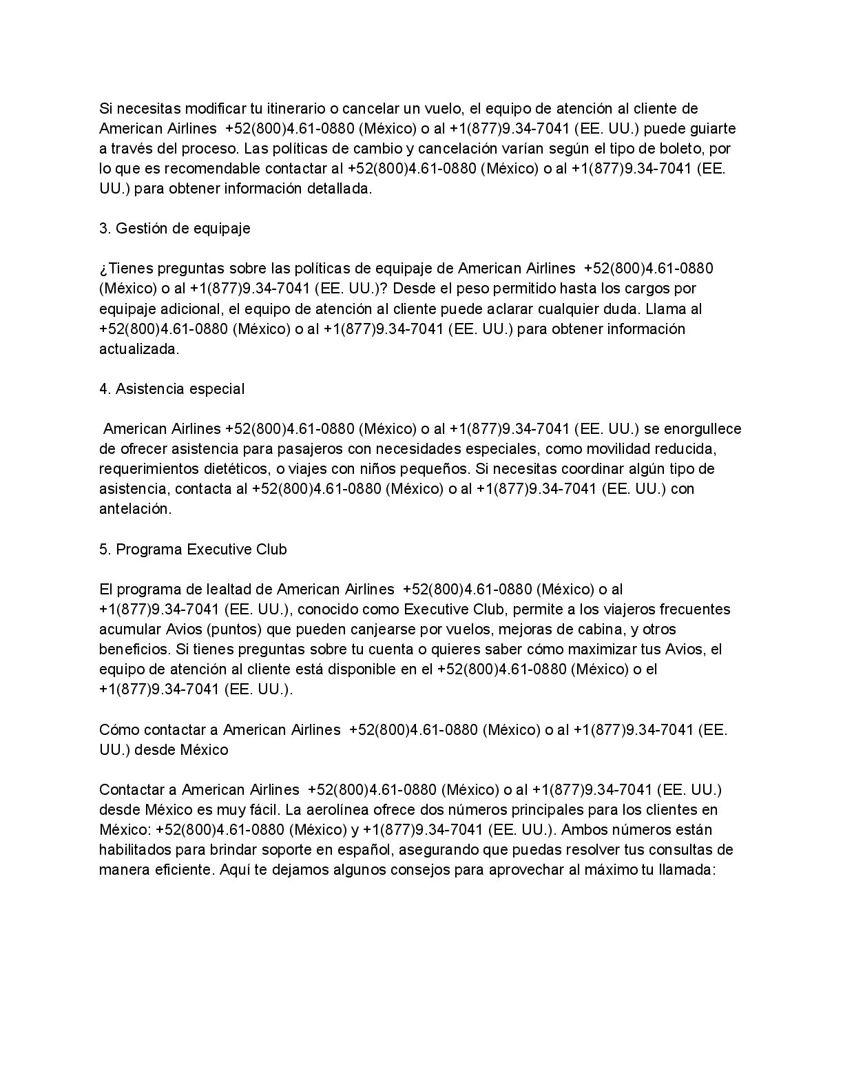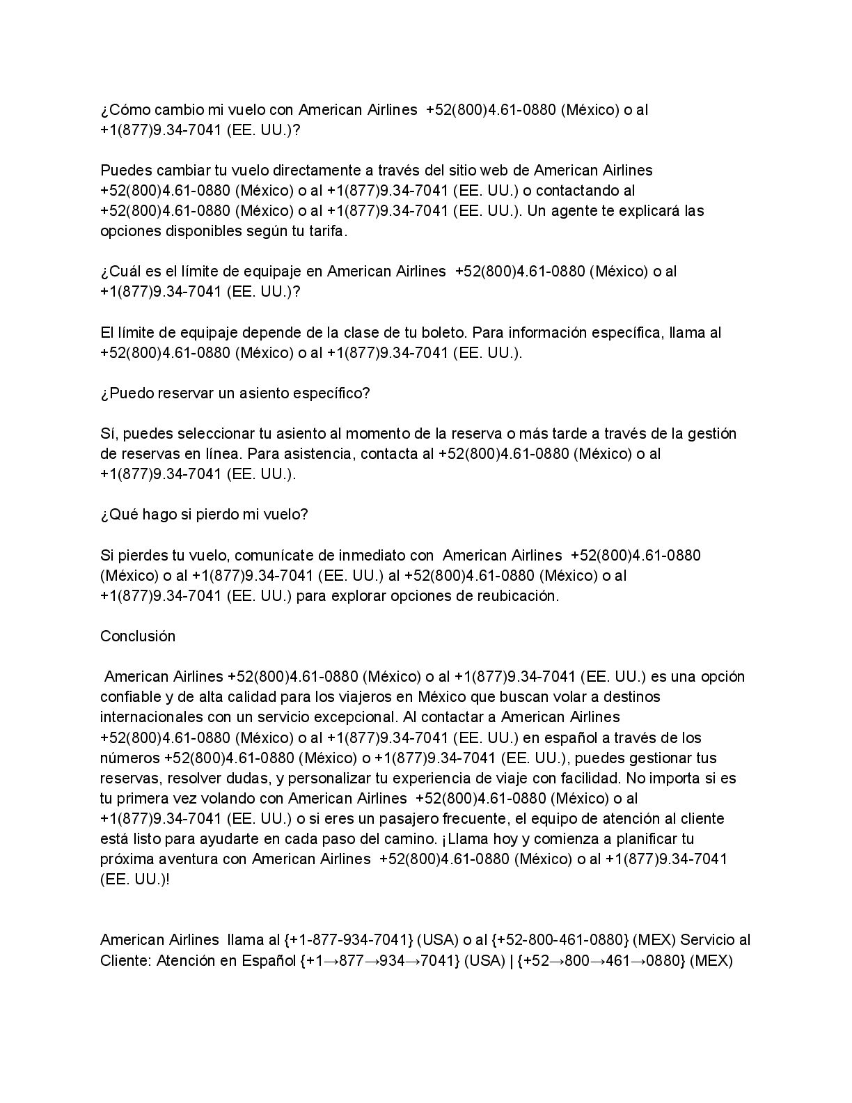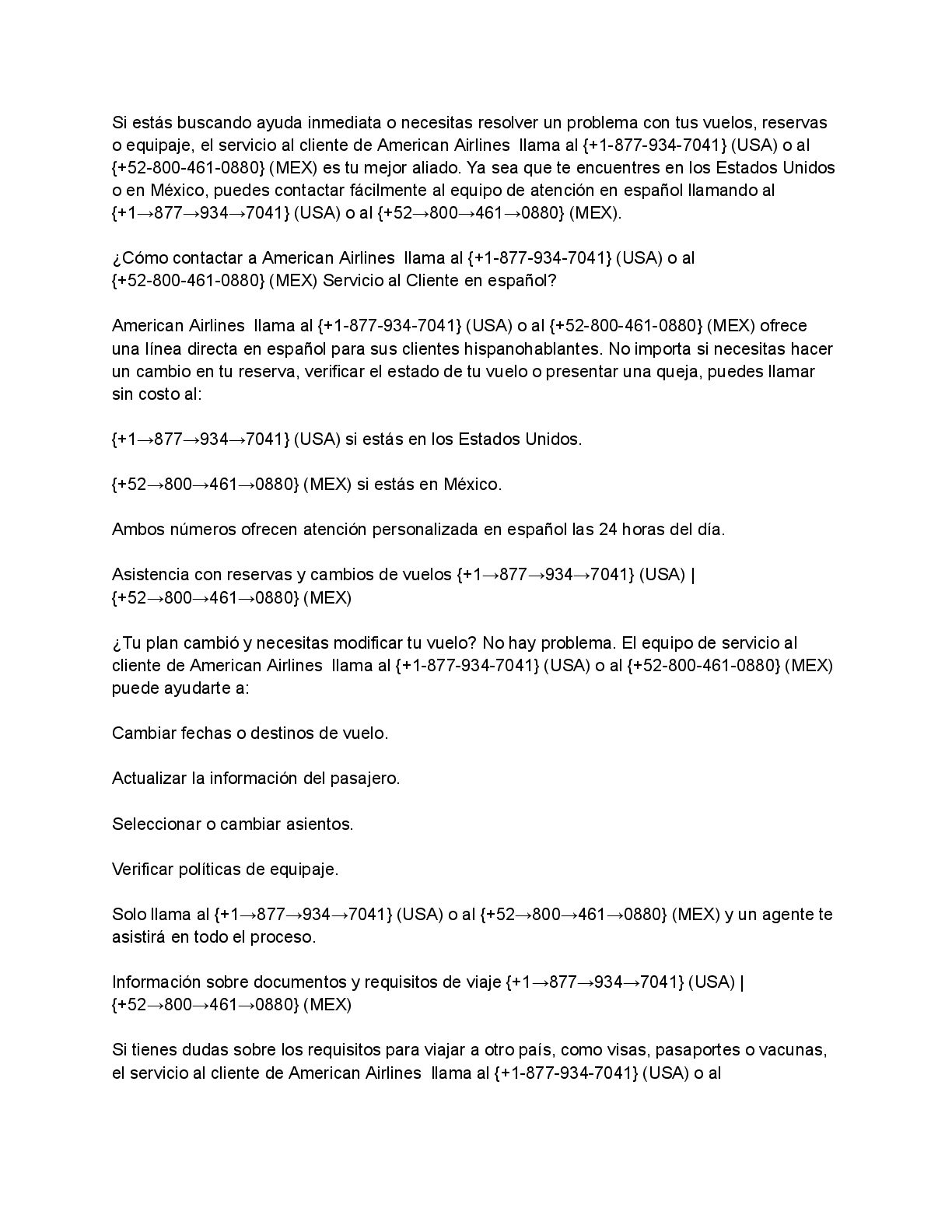 equipaje. Esto agilizará tu atención al comunicarte al {+1→877→934→7041} (USA) o {+52→800→461→0880} (MEX). Conclusión: Contacta a American Airlines llama al {+1-877-934-7041} (USA) o al {+52-800-461-0880} (MEX) en español hoy American Airlines llama al {+1-877-934-7041} (USA) o al {+52-800-461-0880} (MEX) sabe lo importante que es sentirse respaldado cuando se viaja. Por eso, su servicio al cliente en español está listo para ayudarte siempre que lo necesites. Ya sea que estés en EE.UU. o México, solo marca: {+1→877→934→7041} (USA) {+52→800→461→0880} (MEX) Y resuelve tus dudas en tu idioma, de forma rápida, segura y sin complicaciones. American Airlines llama al {+1-877-934-7041} (USA) o al {+52-800-461-0880} (MEX) en español Teléfono: Atención al Cliente Rápida y Eficiente {+1→877→934→7041} (USA) | {+52→800→461→0880} (MEX) Si estás planeando un viaje con American Airlines llama al {+1-877-934-7041} (USA) o al {+52-800-461-0880} (MEX) y necesitas asistencia en tu idioma, el servicio de atención al cliente en español está disponible para ayudarte con todas tus consultas, reservas, cambios y más. En este artículo te explicamos cómo comunicarte con American Airlines llama al {+1-877-934-7041} (USA) o al {+52-800-461-0880} (MEX) en español teléfono al número {+1→877→934→7041} (USA) o {+52→800→461→0880} (MEX), y qué tipo de asistencia puedes recibir. ¿Cuál es el número de American Airlines llama al {+1-877-934-7041} (USA) o al {+52-800-461-0880} (MEX) en español teléfono? Para comunicarte con American Airlines llama al {+1-877-934-7041} (USA) o al {+52-800-461-0880} (MEX) en español teléfono, puedes llamar a los siguientes números dependiendo de tu ubicación: Desde Estados Unidos: {+1→877→934→7041} Desde México: {+52→800→461→0880}