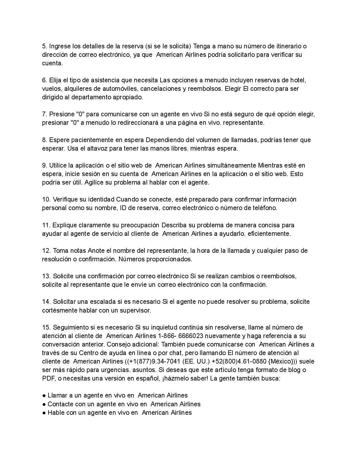 solicita) Tenga a mano su número de itinerario o dirección de correo electrónico, ya que American Airlines podría solicitarlo para verificar su cuenta. 6. Elija el tipo de asistencia que necesita Las opciones a menudo incluyen reservas de hotel, vuelos, alquileres de automóviles, cancelaciones y reembolsos. Elegir El correcto para ser dirigido al departamento apropiado. 7. Presione "0" para comunicarse con un agente en vivo Si no está seguro de qué opción elegir, presionar "0" a menudo lo redireccionará a una página en vivo. representante. 8. Espere pacientemente en espera Dependiendo del volumen de llamadas, podrías tener que esperar. Usa el altavoz para tener las manos libres. mientras espera. 9. Utilice la aplicación o el sitio web de American Airlines simultáneamente Mientras esté en espera, inicie sesión en su cuenta de American Airlines en la aplicación o el sitio web. Esto podría ser útil. Agilice su problema al hablar con el agente. 10. Verifique su identidad Cuando se conecte, esté preparado para confirmar información personal como su nombre, ID de reserva, correo electrónico o número de teléfono. 11. Explique claramente su preocupación Describa su problema de manera concisa para ayudar al agente de servicio al cliente de American Airlines a ayudarlo. eficientemente. 12. Toma notas Anote el nombre del representante, la hora de la llamada y cualquier paso de resolución o confirmación. Números proporcionados. 13. Solicite una confirmación por correo electrónico Si se realizan cambios o reembolsos, solicite al representante que le envíe un correo electrónico con la confirmación. 14. Solicitar una escalada si es necesario Si el agente no puede resolver su problema, solicite cortésmente hablar con un supervisor. 15. Seguimiento si es necesario Si su inquietud continúa sin resolverse, llame al número de atención al cliente de American Airlines 1-866- 6666023 nuevamente y haga referencia a su conversación anterior. Consejo adicional: También puede comunicarse con American Airlines a través de su Centro de ayuda en línea o por chat, pero llamando El número de atención al cliente de American Airlines ((+1(877)9.34-7041 (EE. UU.) +52(800)4.61-0880 {México})) suele ser más rápido para urgencias. asuntos. Si deseas que este artículo tenga formato de blog o PDF, o necesitas una versión en español, ¡házmelo saber! La gente también busca: • Llamar a un agente en vivo en American Airlines • Contacte con un agente en vivo en American Airlines • Hable con un agente en vivo en American Airlines