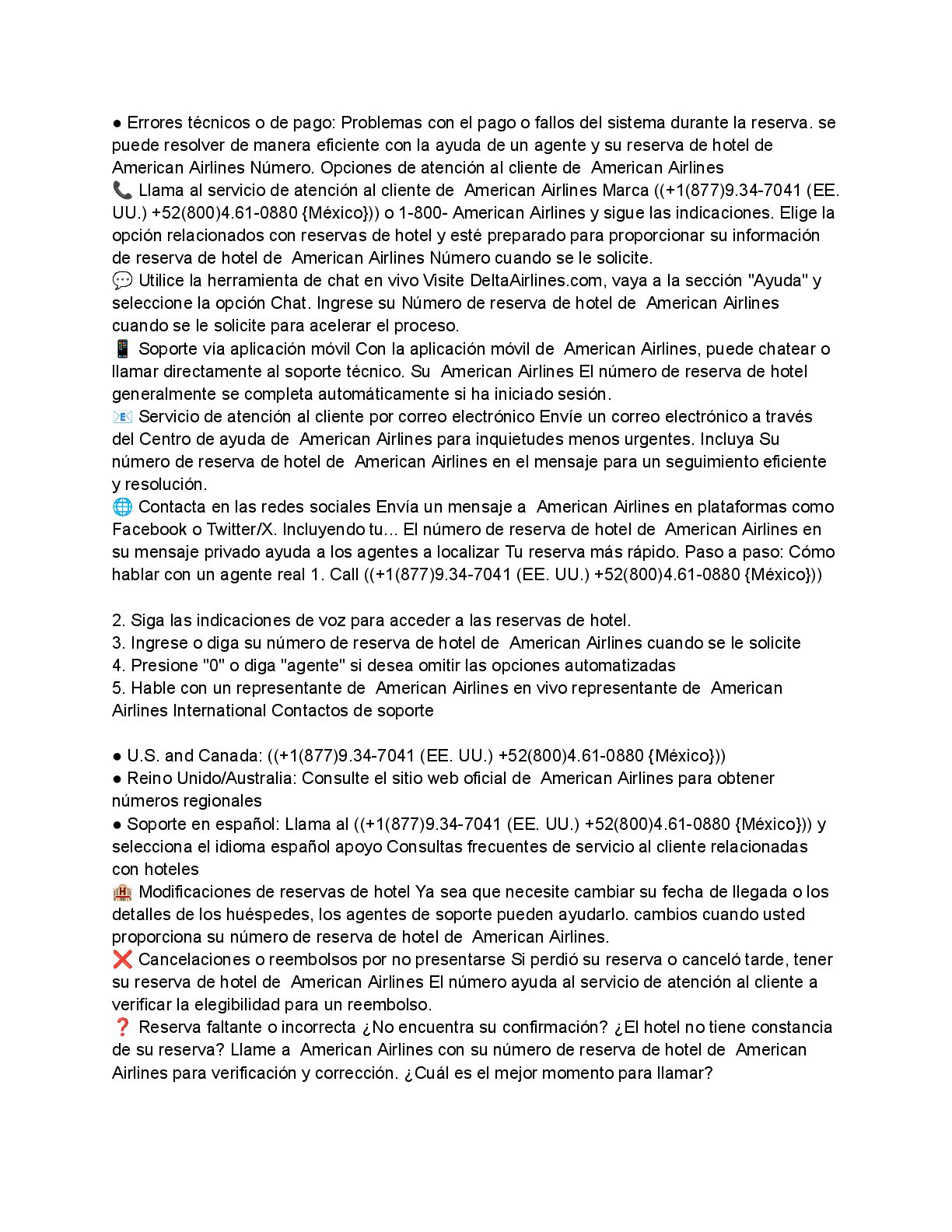 • Conéctese con un agente en vivo en American Airlines • Llamar a un agente en vivo en American Airlines • Llamar a alguien de American Airlines • Contactar a alguien de American Airlines • Hablar con alguien de American Airlines • Habla con alguien de American Airlines • Conéctese con alguien de American Airlines • Llamar a alguien de American Airlines • Hable directamente con American Airlines • Hable con una persona en vivo en American Airlines • Contacte a una persona en vivo en American Airlines • Contactar con un representante de American Airlines • Hable con un agente en vivo en el servicio de atención al cliente de American Airlines • Hable con el servicio de asistencia de American Airlines • Llamar al servicio de asistencia de American Airlines • Hable con el servicio de asistencia de American Airlines Cómo comunicarse con una persona en vivo en American Airlines usando su Número de reserva de hotel de American Airlines Si necesita ayuda con una reserva de hotel a través de American Airlines, la forma más rápida de resolverlo Si tiene algún problema, comuníquese con el servicio de atención al cliente. Puede hablar directamente con un agente en vivo. representante 24/7 llamando al ((+1(877)9.34-7041 (EE. UU.) +52(800)4.61-0880 {México})) o al 1-800- American Airlines. Ya sea que esté ajustar sus fechas de llegada, solicitar un reembolso o confirmar su reserva, tener su Tener a mano el número de reserva de hotel de American Airlines garantizará una asistencia más rápida y precisa. Además de asistencia telefónica, American Airlines también ofrece chat en vivo, correo electrónico y soporte de aplicaciones móviles. e incluso ayuda a través de las redes sociales. Esta guía cubre todas las formas en que puedes conectar con un El agente de American Airlines le explica cómo obtener su número de reserva de hotel de American Airlines Facilita el proceso. ¿Por qué contactar a una persona en vivo usando tu hotel de American Airlines? ¿Número de reserva? Si bien el sistema automatizado de American Airlines puede manejar algunas solicitudes, hay muchas Situaciones en las que hablar con un agente en vivo es más efectivo. Aquí te mostramos cuándo llamar 1→877-934-7041 con su número de reserva de hotel de American Airlines puede ayudarle: • Cambios de fecha o cancelación: ¿Necesita modificar o cancelar una reserva de hotel? Un agente... Puede ayudarlo rápidamente si proporciona su número de reserva de hotel de American Airlines. • Problemas de confirmación de la reserva: No recibí un correo electrónico de confirmación o el hotel no puede encontrarlo ¿Su reserva? Llamar con su número de reserva de hotel de American Airlines le ayudará a resolver el problema. confusión. • Solicitudes de reembolso: si es elegible para un reembolso debido a cancelación o insatisfacción, Proporcionar su número de reserva de hotel de American Airlines acelera el proceso de reclamación.