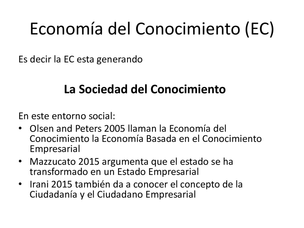 La Sociedad del Conocimiento En este entorno social: • Olsen and Peters 2005 llaman la Economía del Conocimiento la Economía Basada en el Conocimiento Empresarial • Mazzucato 2015 argumenta que el estado se ha transformado en un Estado Empresarial • Irani 2015 también da a conocer el concepto de la Ciudadanía y el Ciudadano Empresarial