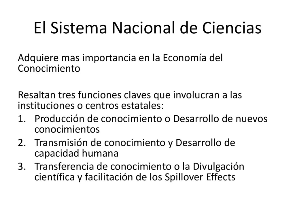 Economía del Conocimiento Resaltan tres funciones claves que involucran a las instituciones o centros estatales: 1. Producción de conocimiento o Desarrollo de nuevos conocimientos 2. Transmisión de conocimiento y Desarrollo de capacidad humana 3. Transferencia de conocimiento o la Divulgación científica y facilitación de los Spillover Effects