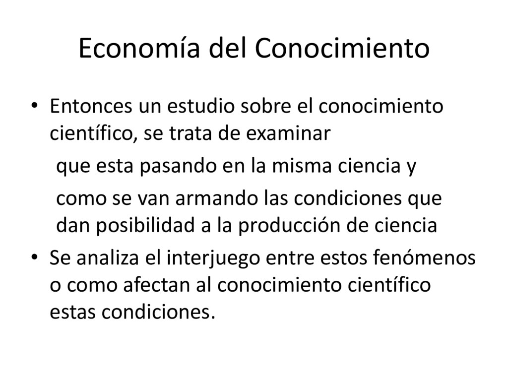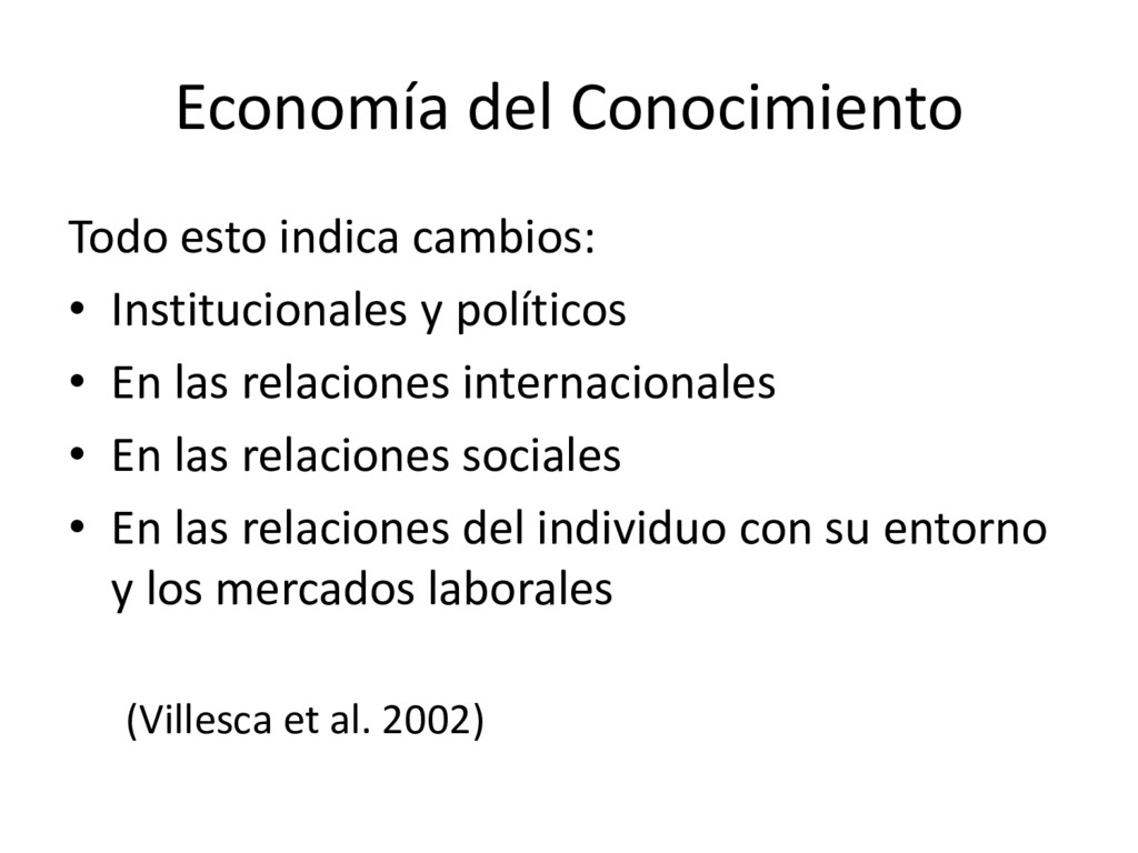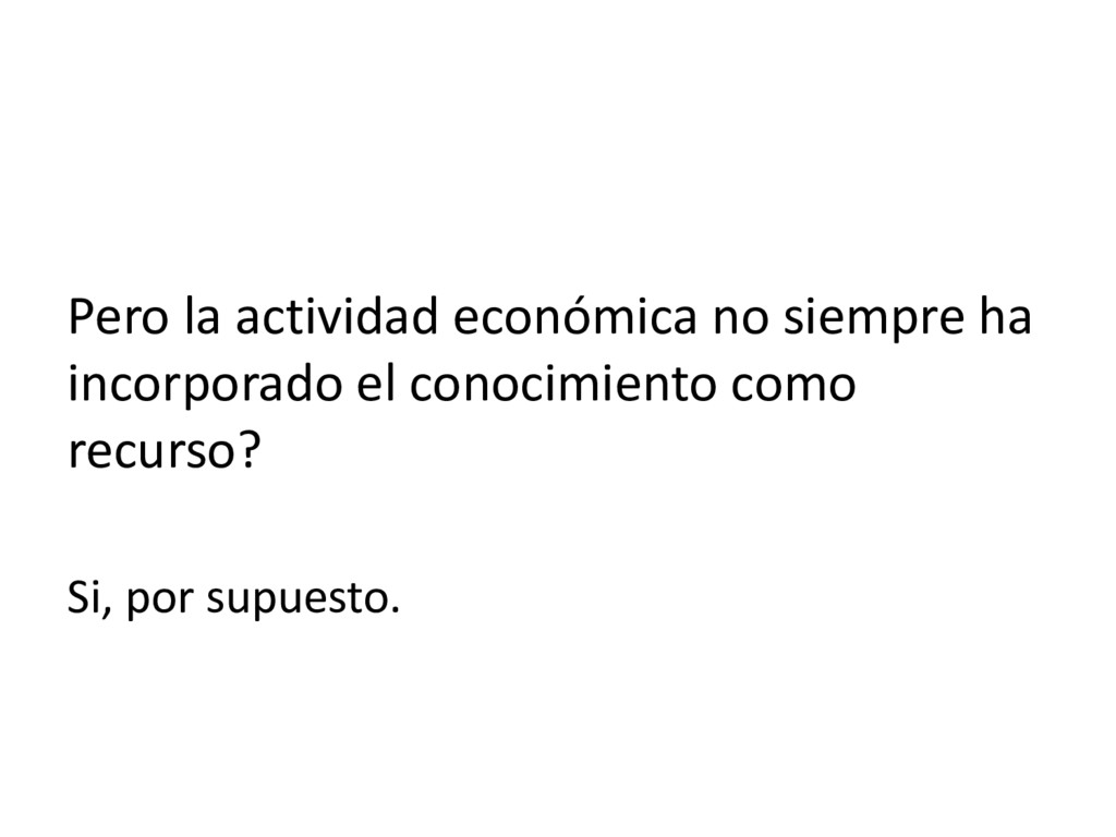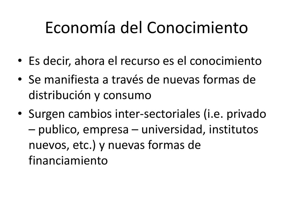 de la economía mas intensiva en conocimiento • A las actividades de la economía densas en conocimiento (Truellen et al. 2001) • A los modos de producción intensivos en conocimiento (Powell and Snellman 2004) Lo importante no siempre es lo que se produce si no como se produce, que conocimientos se generan, y a que otros sectores económicos estos conocimientos estimulan