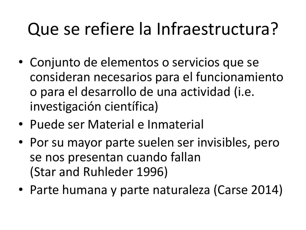 servicios que se consideran necesarios para el funcionamiento o para el desarrollo de una actividad (i.e. investigación científica) • Puede ser Material e Inmaterial • Por su mayor parte suelen ser invisibles, pero se nos presentan cuando fallan (Star and Ruhleder 1996) • Parte humana y parte naturaleza (Carse 2014)