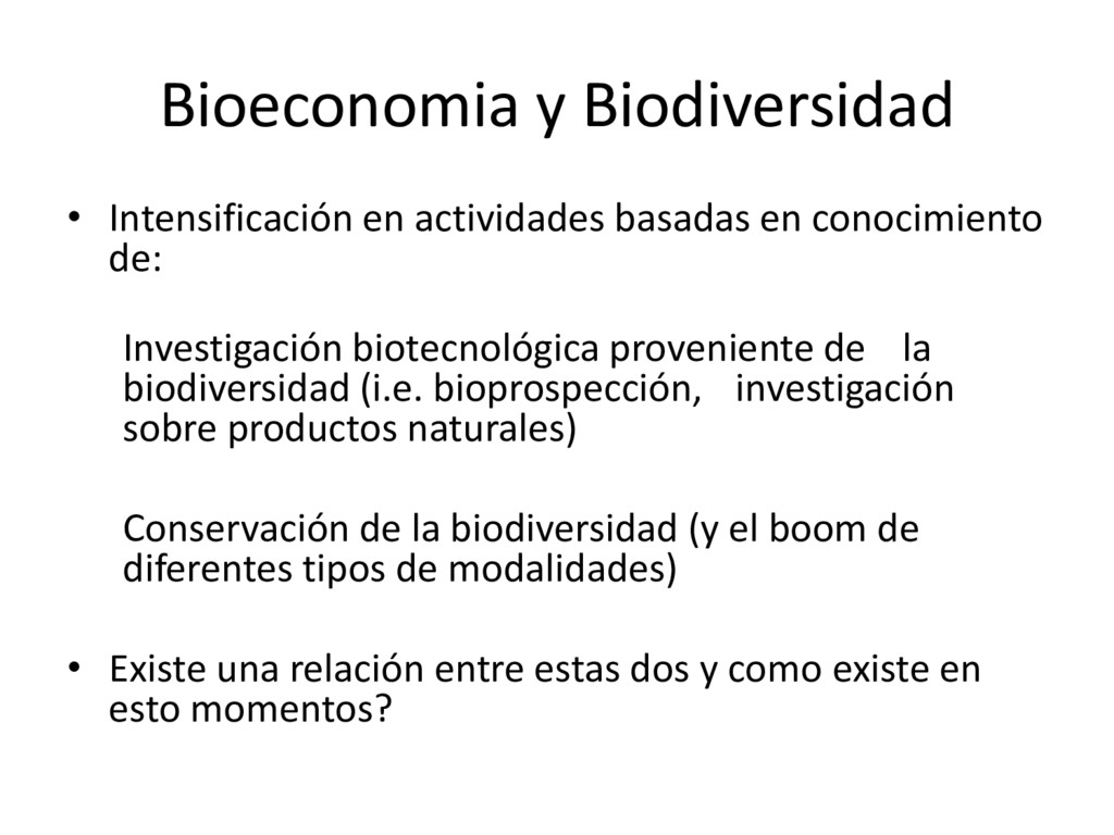 de: Investigación biotecnológica proveniente de la biodiversidad (i.e. bioprospección, investigación sobre productos naturales) Conservación de la biodiversidad (y el boom de diferentes tipos de modalidades) • Existe una relación entre estas dos y como existe en esto momentos?