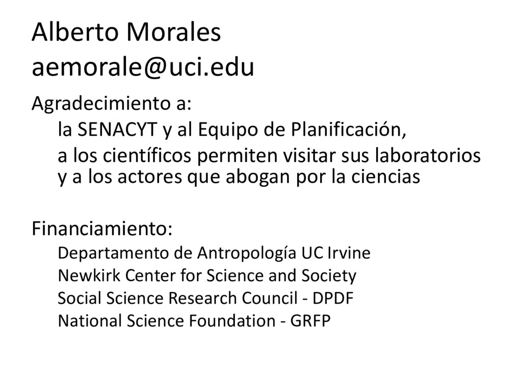 de Planificación, a los científicos permiten visitar sus laboratorios y a los actores que abogan por la ciencias Financiamiento: Departamento de Antropología UC Irvine Newkirk Center for Science and Society Social Science Research Council - DPDF National Science Foundation - GRFP