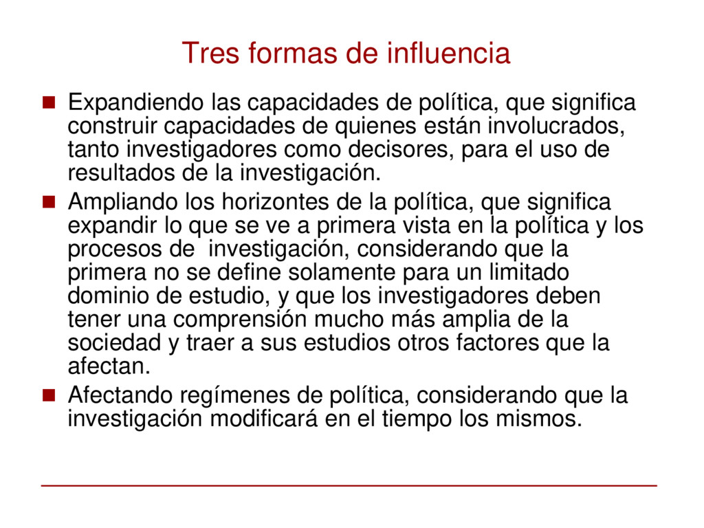que significa construir capacidades de quienes están involucrados, tanto investigadores como decisores, para el uso de resultados de la investigación. Ampliando los horizontes de la política, que significa expandir lo que se ve a primera vista en la política y los procesos de investigación, considerando que la primera no se define solamente para un limitado dominio de estudio, y que los investigadores deben tener una comprensión mucho más amplia de la sociedad y traer a sus estudios otros factores que la afectan. Afectando regímenes de política, considerando que la investigación modificará en el tiempo los mismos.