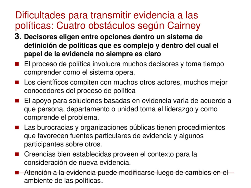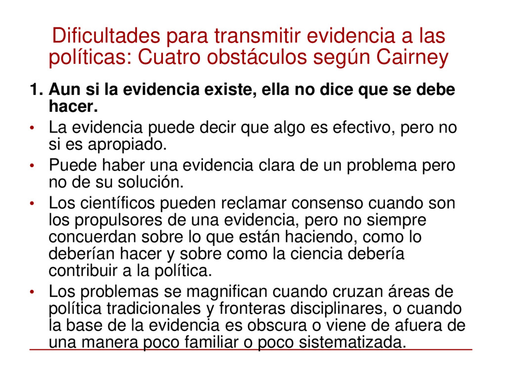 Cairney 1. Aun si la evidencia existe, ella no dice que se debe hacer. • La evidencia puede decir que algo es efectivo, pero no si es apropiado. • Puede haber una evidencia clara de un problema pero no de su solución. • Los científicos pueden reclamar consenso cuando son los propulsores de una evidencia, pero no siempre concuerdan sobre lo que están haciendo, como lo deberían hacer y sobre como la ciencia debería contribuir a la política. • Los problemas se magnifican cuando cruzan áreas de política tradicionales y fronteras disciplinares, o cuando la base de la evidencia es obscura o viene de afuera de una manera poco familiar o poco sistematizada.