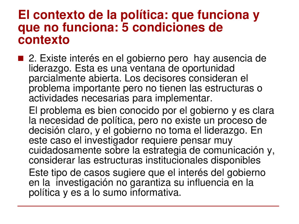 funciona: 5 condiciones de contexto 2. Existe interés en el gobierno pero hay ausencia de liderazgo. Esta es una ventana de oportunidad parcialmente abierta. Los decisores consideran el problema importante pero no tienen las estructuras o actividades necesarias para implementar. El problema es bien conocido por el gobierno y es clara la necesidad de política, pero no existe un proceso de decisión claro, y el gobierno no toma el liderazgo. En este caso el investigador requiere pensar muy cuidadosamente sobre la estrategia de comunicación y, considerar las estructuras institucionales disponibles Este tipo de casos sugiere que el interés del gobierno en la investigación no garantiza su influencia en la política y es a lo sumo informativa.