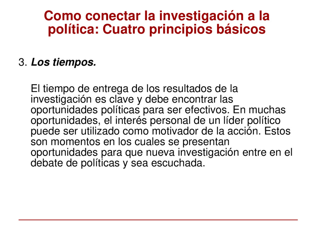 3. Los tiempos. El tiempo de entrega de los resultados de la investigación es clave y debe encontrar las oportunidades políticas para ser efectivos. En muchas oportunidades, el interés personal de un líder político puede ser utilizado como motivador de la acción. Estos son momentos en los cuales se presentan oportunidades para que nueva investigación entre en el debate de políticas y sea escuchada.