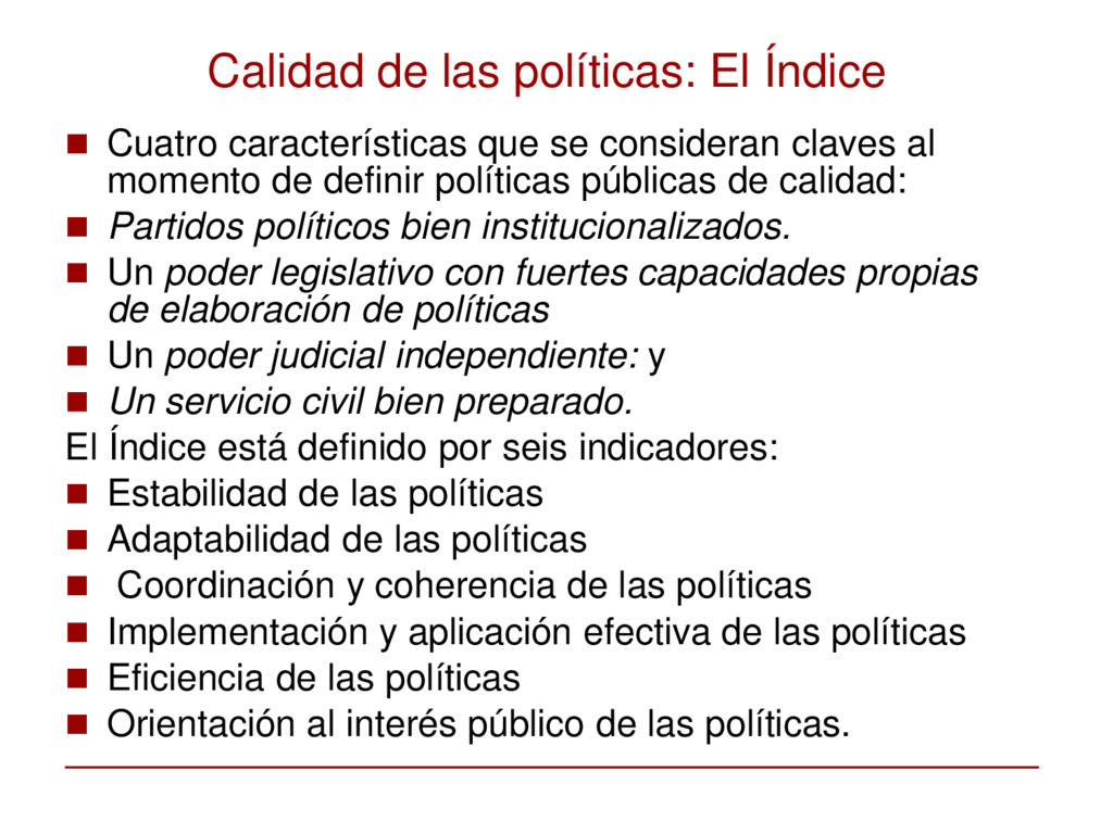se consideran claves al momento de definir políticas públicas de calidad: Partidos políticos bien institucionalizados. Un poder legislativo con fuertes capacidades propias de elaboración de políticas Un poder judicial independiente: y Un servicio civil bien preparado. El Índice está definido por seis indicadores: Estabilidad de las políticas Adaptabilidad de las políticas Coordinación y coherencia de las políticas Implementación y aplicación efectiva de las políticas Eficiencia de las políticas Orientación al interés público de las políticas.