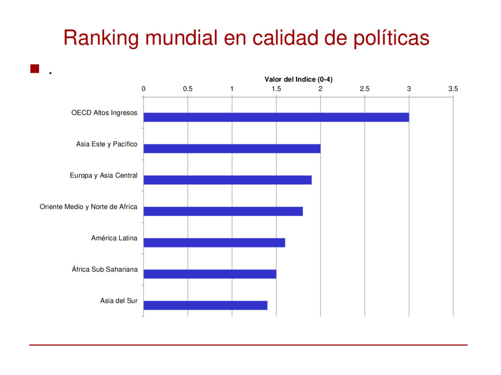 1 1.5 2 2.5 3 3.5 OECD Altos Ingresos Asia Este y Pacífico Europa y Asia Central Oriente Medio y Norte de Afríca América Latina África Sub Sahariana Asia del Sur Valor del Indice (0-4)