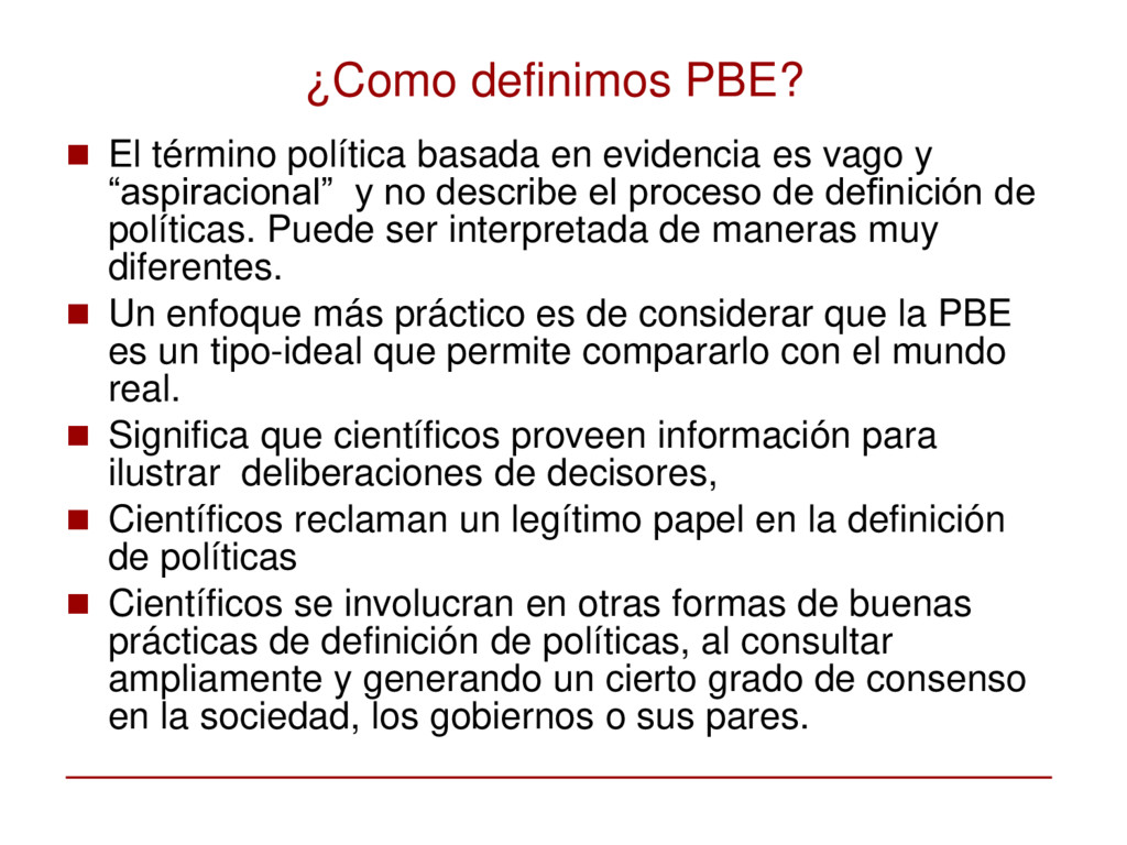 PBE Para informar de soluciones a un problema identificado por decisores Como una de muchas fuentes de información utilizadas por decisores junto con consejos de actores y la experiencia profesional y de servicios. Como un recurso utilizado selectivamente por políticos con posiciones irreducibles, para fortalecer sus casos Como un instrumento para mostrar que está actuando, al establecer un estudio científico, o para medir cuán bien la política está funcionando Como una fuente de “iluminación” modelando como las personas piensa en el largo plazo.