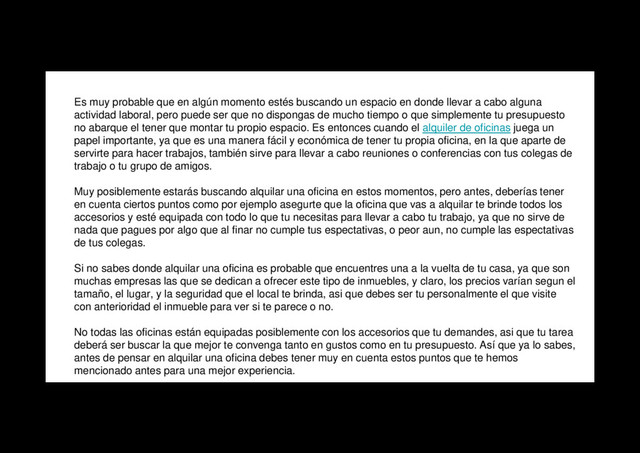 espacio en donde llevar a cabo alguna actividad laboral, pero puede ser que no dispongas de mucho tiempo o que simplemente tu presupuesto no abarque el tener que montar tu propio espacio. Es entonces cuando el alquiler de oficinas juega un papel importante, ya que es una manera fácil y económica de tener tu propia oficina, en la que aparte de servirte para hacer trabajos, también sirve para llevar a cabo reuniones o conferencias con tus colegas de trabajo o tu grupo de amigos. Muy posiblemente estarás buscando alquilar una oficina en estos momentos, pero antes, deberías tener en cuenta ciertos puntos como por ejemplo asegurte que la oficina que vas a alquilar te brinde todos los accesorios y esté equipada con todo lo que tu necesitas para llevar a cabo tu trabajo, ya que no sirve de nada que pagues por algo que al finar no cumple tus espectativas, o peor aun, no cumple las espectativas de tus colegas. Si no sabes donde alquilar una oficina es probable que encuentres una a la vuelta de tu casa, ya que son muchas empresas las que se dedican a ofrecer este tipo de inmuebles, y claro, los precios varían segun el tamaño, el lugar, y la seguridad que el local te brinda, asi que debes ser tu personalmente el que visite con anterioridad el inmueble para ver si te parece o no. No todas las oficinas están equipadas posiblemente con los accesorios que tu demandes, asi que tu tarea deberá ser buscar la que mejor te convenga tanto en gustos como en tu presupuesto. Así que ya lo sabes, antes de pensar en alquilar una oficina debes tener muy en cuenta estos puntos que te hemos mencionado antes para una mejor experiencia.
