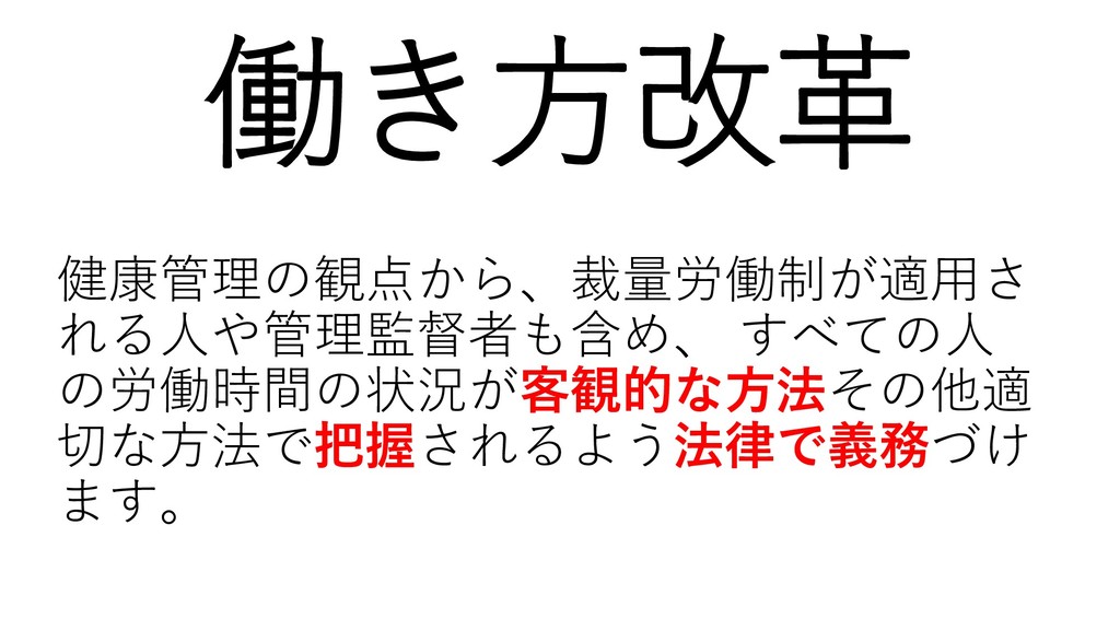 働き方改革 健康管理の観点から、裁量労働制が適用さ れる人や管理監督者も含め、 すべての人 の労働時間の状況が客観的な方法その他適 切な方法で把握されるよう法律で義務づけ ます。