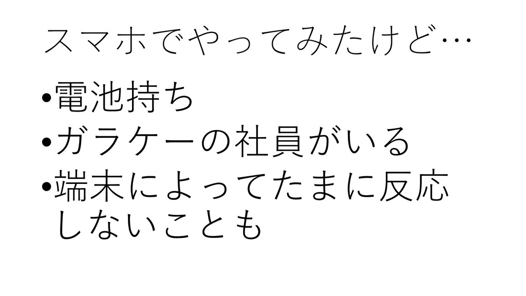スマホでやってみたけど… •電池持ち •ガラケーの社員がいる •端末によってたまに反応 しないことも