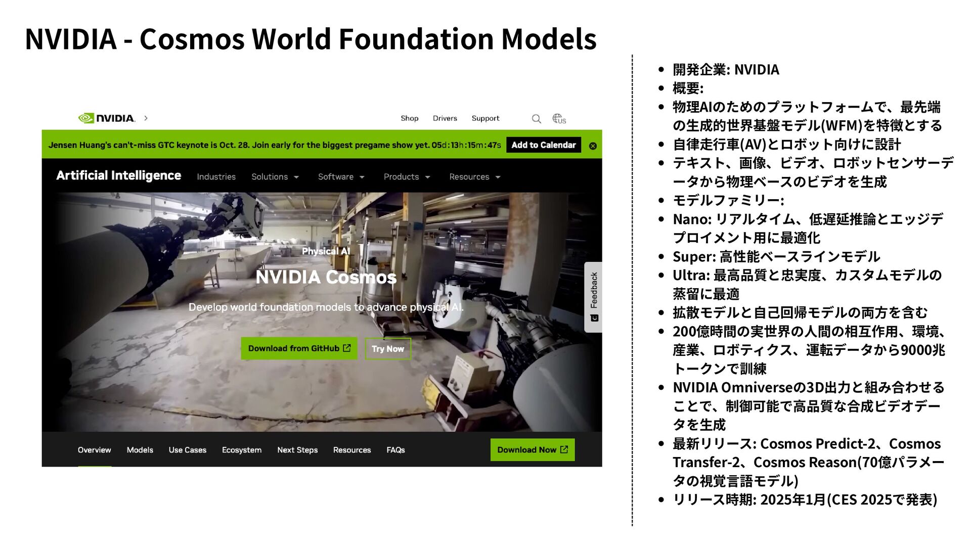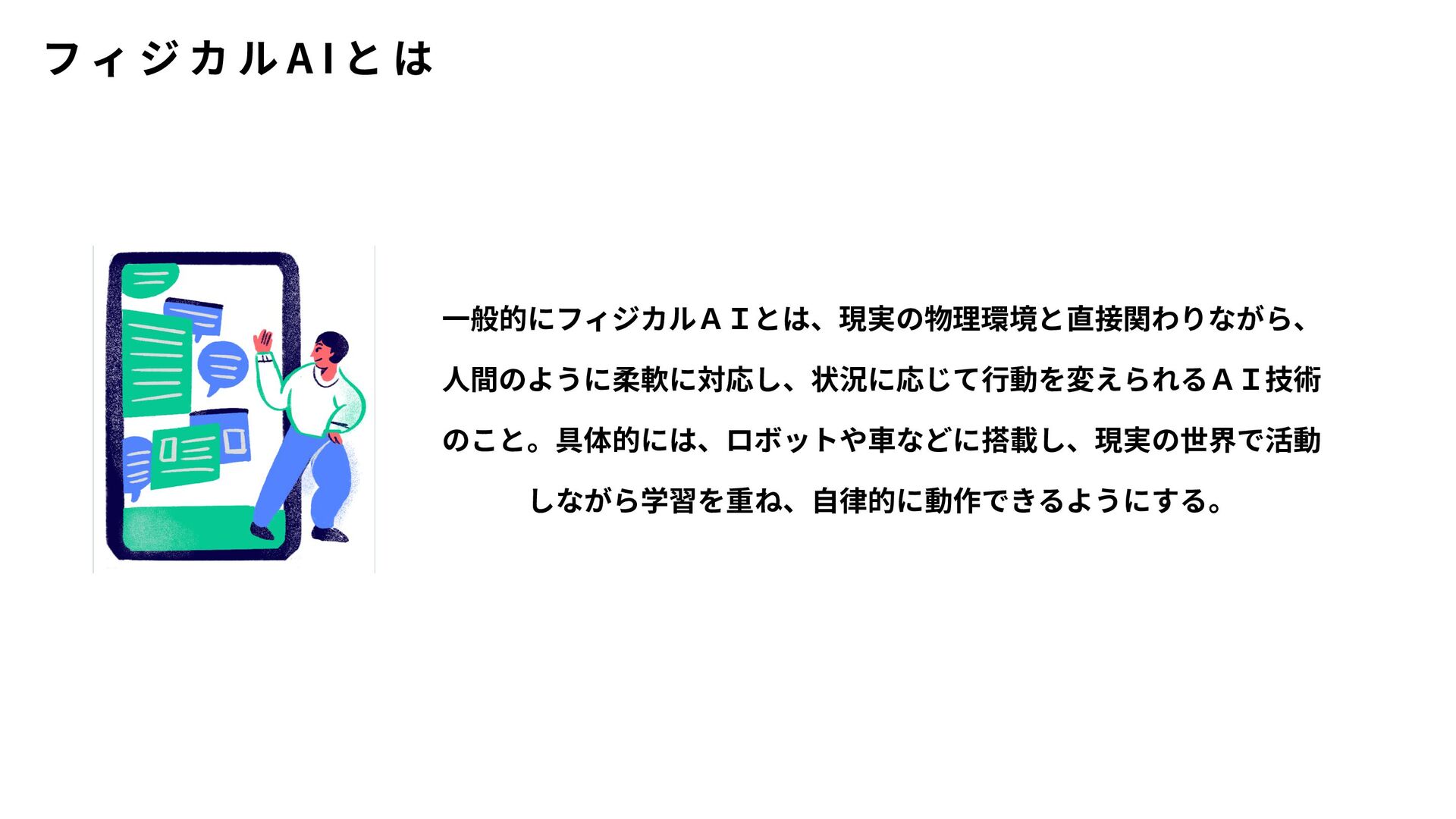 ラ イ チ ェ ー ン 建 設 ・ イ ン フ ラ 農 業 ・ 食 品 人手による組立作業・目視品質検査・設備保守点 検・工程管理業務・在庫管理 ロボットフリート管理サービス・AIファクトリー コンサルティング・デジタルツイン工場設計・予 知保全プラットフォーム・カスタムオーダー製造 サービス 倉庫内ピッキング作業・配送ドライバー業務<・ 荷物仕分け作業・在庫棚卸し・ラストワンマイル 配送 フリート管理AI・配送ロボット保守サービス・サ プライチェーン最適化コンサル・ドローン配送イ ンフラ・自律配送ネットワーク運営 基礎工事作業・鉄筋組立・コンクリート打設・内 装施工・インフラ点検業務 建設ロボットオペレーター・3Dプリント建築サー ビス・スマートインフラ管理・ドローン点検サー ビス・BIMデジタルツイン構築 ・播種・収穫作業<br>・除草・農薬散布<br>・ 選果・選別作業<br>・畜産の給餌・搾乳<br>・ 圃場管理 農業ロボットメンテナンス・AIアグリコンサルテ ィング・垂直農場運営・精密農業データ分析・植 物工場最適化サービス フィジカルAIで置き換わる分野 フィジカルAIで生まれる新分野 市 場 規 模 の 全 体 像 ( 2 0 3 5 年 予 測 )