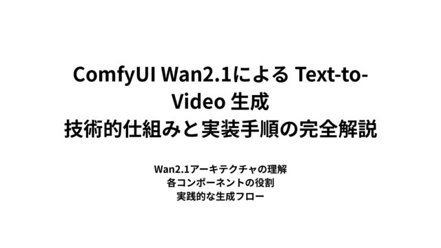 a garden" ↓ [0.8, 0.2, -0.5, 0.3, ...] (768次元ベクトル) 特徴 XXLサイズ(最大規模) fp3量子化(軽量化) 動画特化の時空間理解 CLIP - テキストエンコーダーの役割 "赤い猫が歩く" [0.8, 0.2, -0.5, 0.9, -0.1, ...] (768個の数字) 日本語: "猫" → [0.8, 0.2, -0.5, ...] 英語: "cat" → [0.81, 0.19, -0.52, ...] # ほぼ同じ数字! 中国語: "猫" → [0.79, 0.21, -0.48, ...] # これもほぼ同じ! UMT5の学習データ: - 100以上の言語 - 数億枚の画像と説明文 - 「同じ意味なら同じ数字になるように」学習