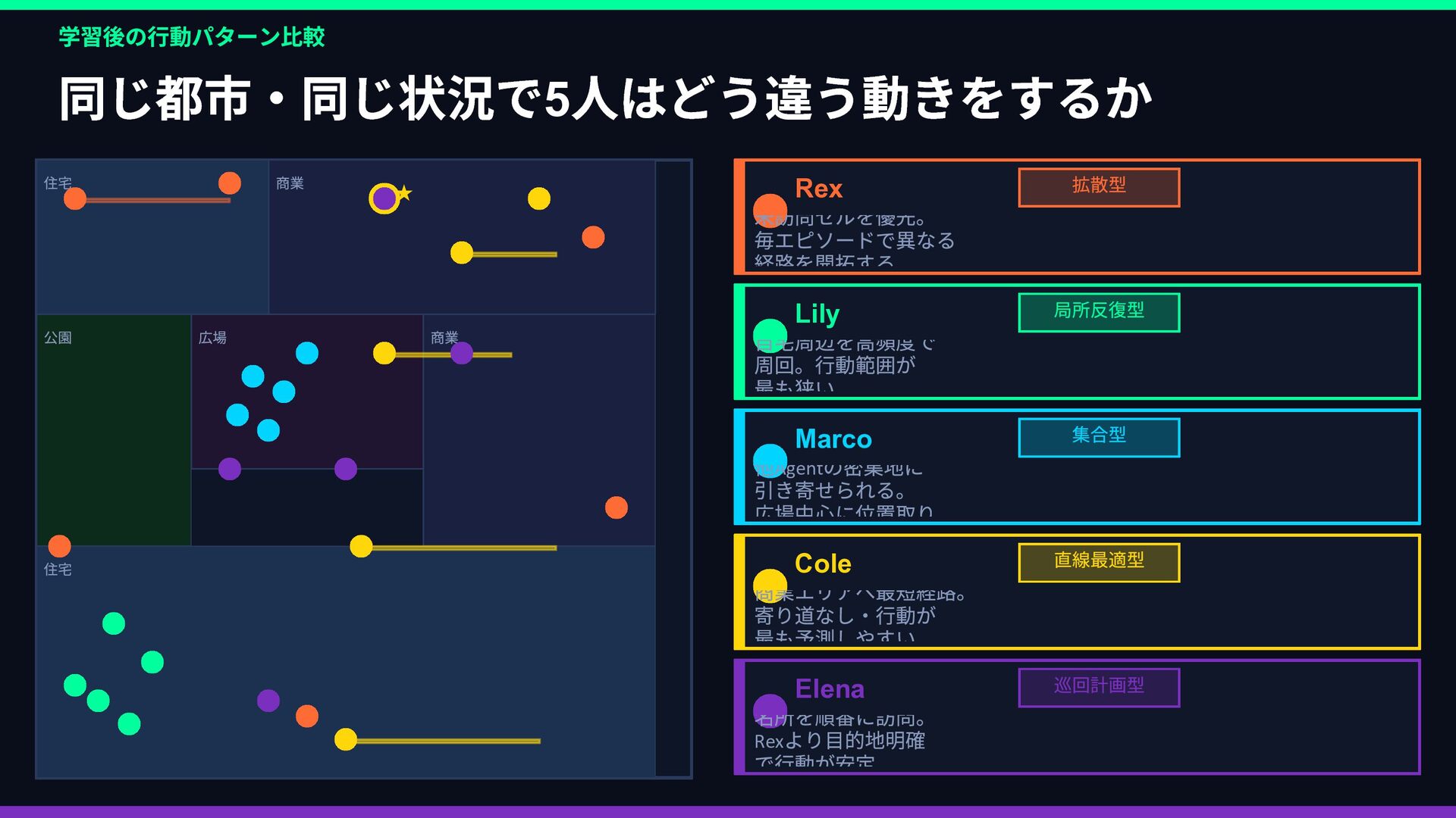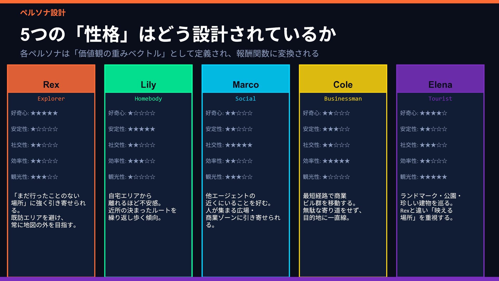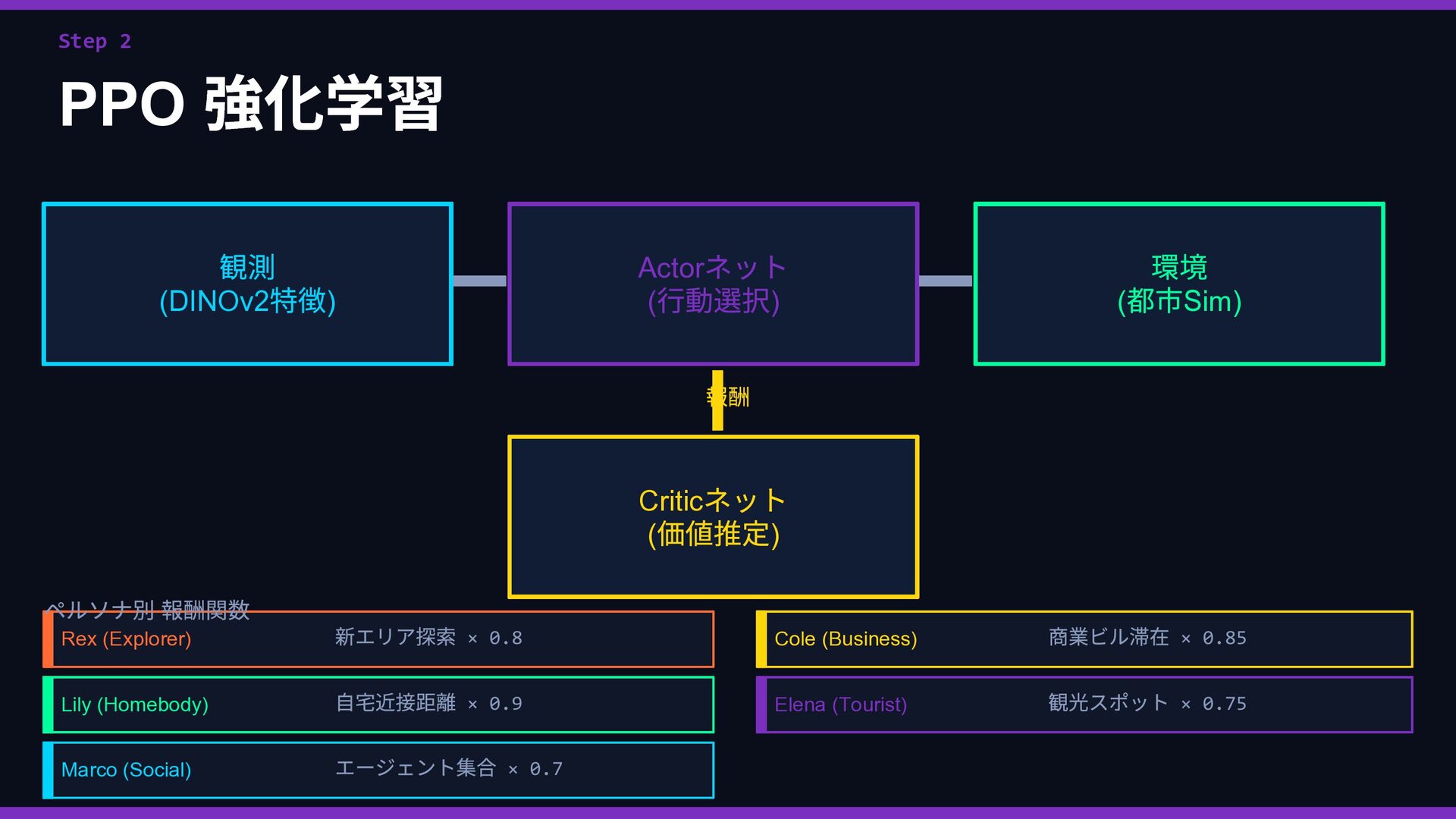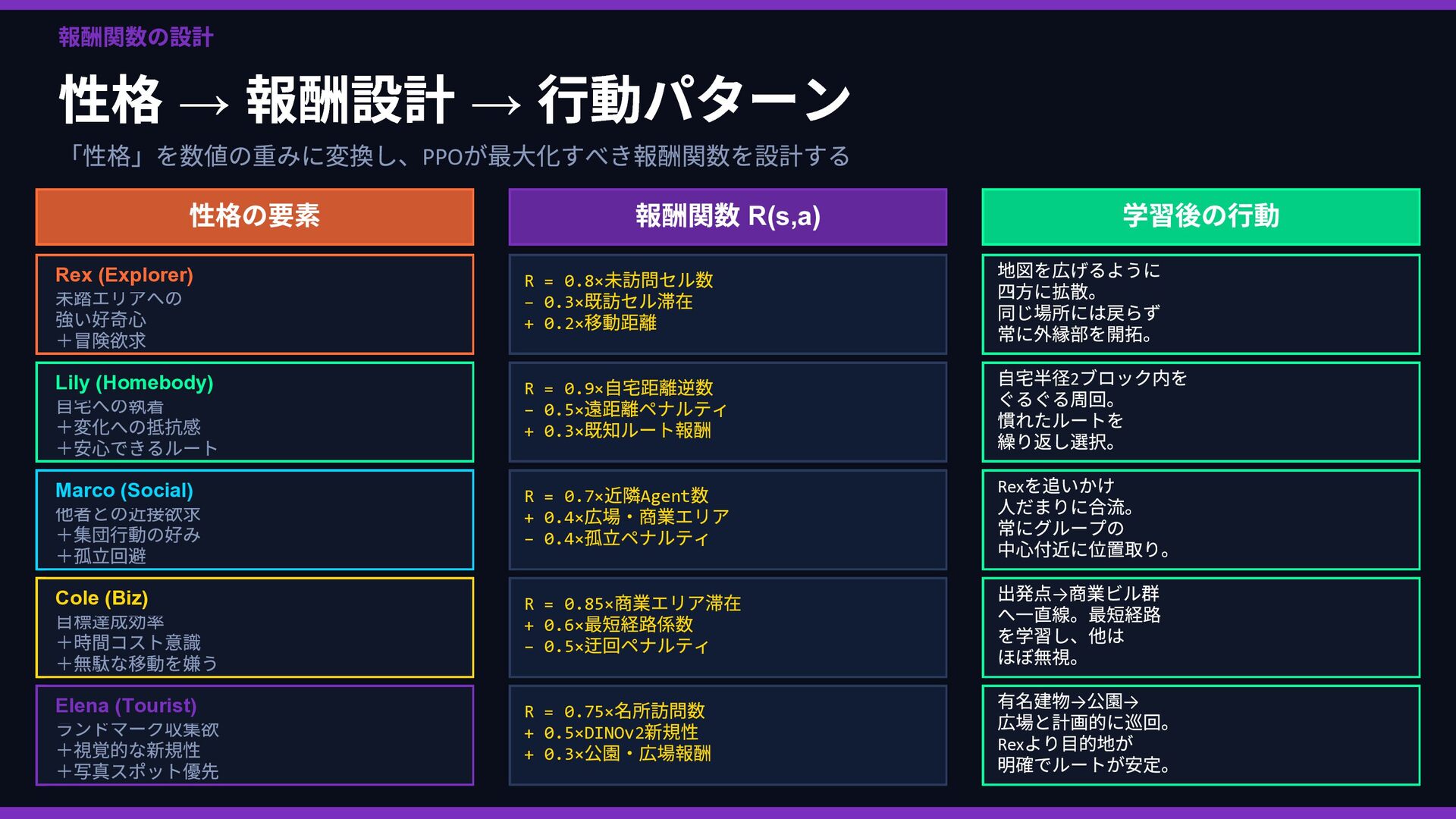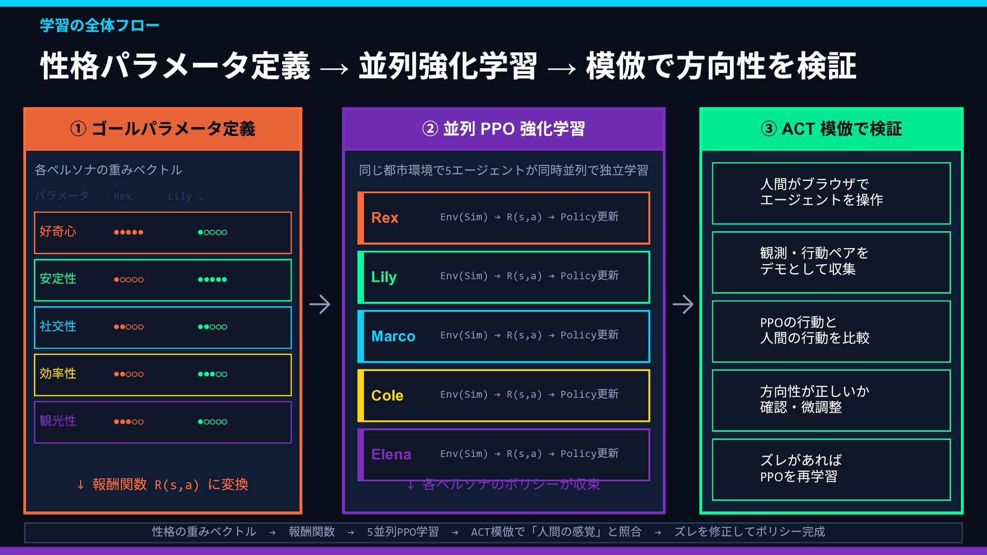 Rex Lily … 好奇心 ••••• •◦◦◦◦ 安定性 •◦◦◦◦ ••••• 社交性 ••◦◦◦ ••◦◦◦ 効率性 ••◦◦◦ •••◦◦ 観光性 •••◦◦ •◦◦◦◦ ↓ 報酬関数 R(s,a) に変換 → ② 並列 PPO 強化学習 同じ都市環境で5 エージェントが同時並列で独立学習 Rex Env(Sim) → R(s,a) → Policy 更新 Lily Env(Sim) → R(s,a) → Policy 更新 Marco Env(Sim) → R(s,a) → Policy 更新 Cole Env(Sim) → R(s,a) → Policy 更新 Elena Env(Sim) → R(s,a) → Policy 更新 ↓ 各ペルソナのポリシーが収束 → ③ ACT 模倣で検証 👤 人間がブラウザで エージェントを操作 📋 観測・行動ペアを デモとして収集 🔍 PPO の行動と 人間の行動を比較 ✅ 方向性が正しいか 確認・微調整 🔄 ズレがあれば PPO を再学習 性格の重みベクトル → 報酬関数 → 5 並列PPO 学習 → ACT 模倣で「人間の感覚」と照合 → ズレを修正してポリシー完成