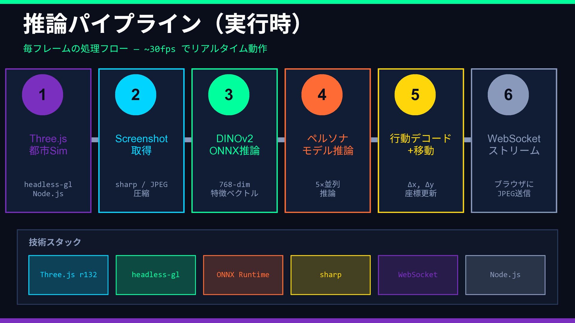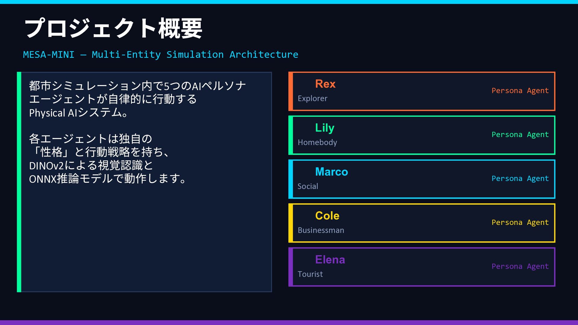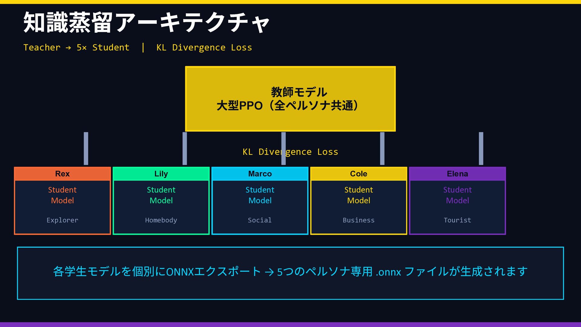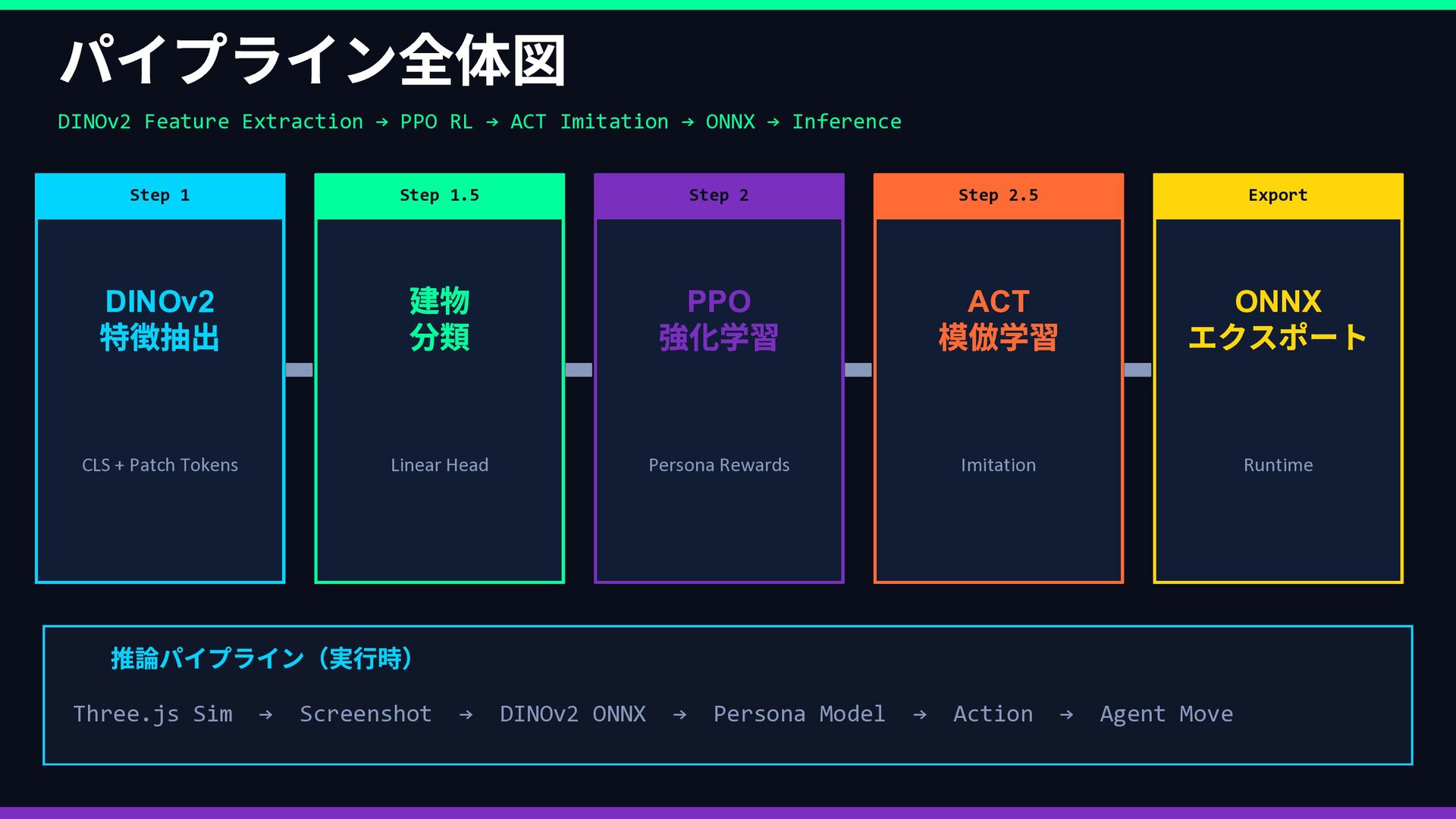 Rex Lily … 好奇心 ••••• •◦◦◦◦ 安定性 •◦◦◦◦ ••••• 社交性 ••◦◦◦ ••◦◦◦ 効率性 ••◦◦◦ •••◦◦ 観光性 •••◦◦ •◦◦◦◦ ↓ 報酬関数 R(s,a) に変換 → ② 並列 PPO 強化学習 同じ都市環境で5 エージェントが同時並列で独立学習 Rex Env(Sim) → R(s,a) → Policy 更新 Lily Env(Sim) → R(s,a) → Policy 更新 Marco Env(Sim) → R(s,a) → Policy 更新 Cole Env(Sim) → R(s,a) → Policy 更新 Elena Env(Sim) → R(s,a) → Policy 更新 ↓ 各ペルソナのポリシーが収束 → ③ ACT 模倣で検証 👤 人間がブラウザで エージェントを操作 📋 観測・行動ペアを デモとして収集 🔍 PPO の行動と 人間の行動を比較 ✅ 方向性が正しいか 確認・微調整 🔄 ズレがあれば PPO を再学習 性格の重みベクトル → 報酬関数 → 5 並列PPO 学習 → ACT 模倣で「人間の感覚」と照合 → ズレを修正してポリシー完成
